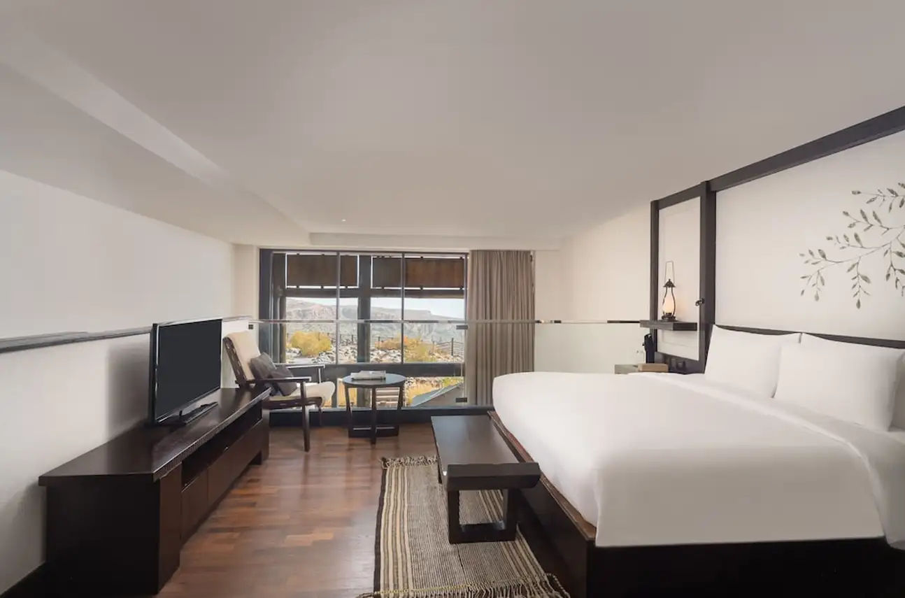 Cet hôtel a été écoconstruit selon des techniques traditionnelles, en s'inspirant de l'architecture des anciens forts. Toutes ses façades sont composées de pierre excavée lors des fondations — une pierre composée d’ophiolite, une roche cristalline dont les strates de différentes nuances témoignent d’un passé tectonique mouvementé. En harmonie totale avec le décor minéral ! Dans les chambres, les peintures sur les têtes de lit, qui représentent des branches de genévrier, ont été réalisées par des artistes locaux. Et en plus, le service de conciergerie vous concocte des circuits sur mesure, désireux de créer pour vous des expériences authentiques, pas seulement des souvenirs… Grâce à lui, vous pouvez ainsi déjeuner chez l’habitant, qui vous fera l’honneur des traditions locales !