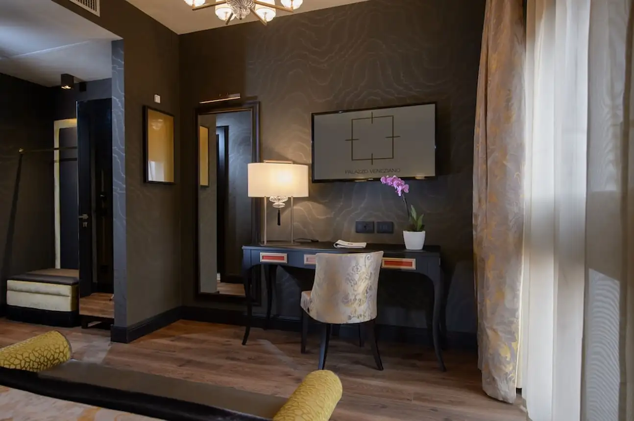 Les 84 chambres (20 m2 à 28 m2) et suites (30 m2 à 70 m2) de l’hôtel reflètent l’élégance intemporelle du Palazzo : parquet, tissus précieux, lustres de Murano et salles de bain en marbre de Carrare. Très rare à Venise : les chambres et suites panoramiques disposent d’une terrasse avec jacuzzi ! Vous en aurez plein les yeux ! Fans de détente absolue ? Craquez pour une luxury suite avec spa privatif. Les amoureux profiteront d’une intimité douillette dans une suite d’angle en or et noir, le bain à remous trône au milieu. Les suites duplex, elles, sont idéales pour les familles ou les groupes d'amis !