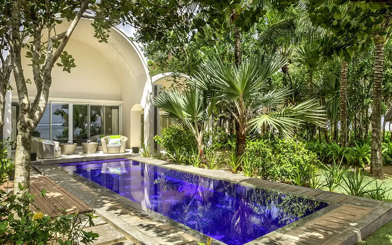 La SO Beach Villa possède un lit King Size, jardin privatif avec un bassin profond et offre une vue directe sur l'océan et accès direct à la plage par les jardins tropicaux.