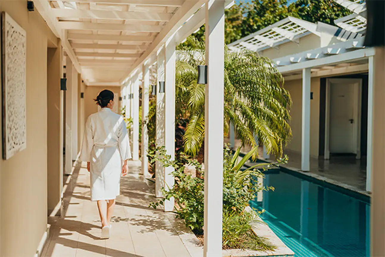 - Junior suite en front de mer avec piscine (65 m²) réservée aux adultes et aux + de 12 ans. Toit de chaume et vue sur la mangrove, salle de bain avec douche, terrasse avec piscine privée. Capacité : 3 adultes. Renommée villa avec piscine privée à compter du 1/11/25.
