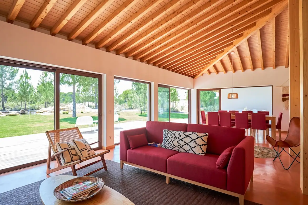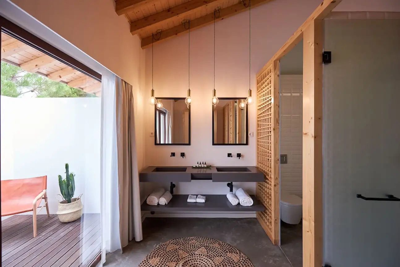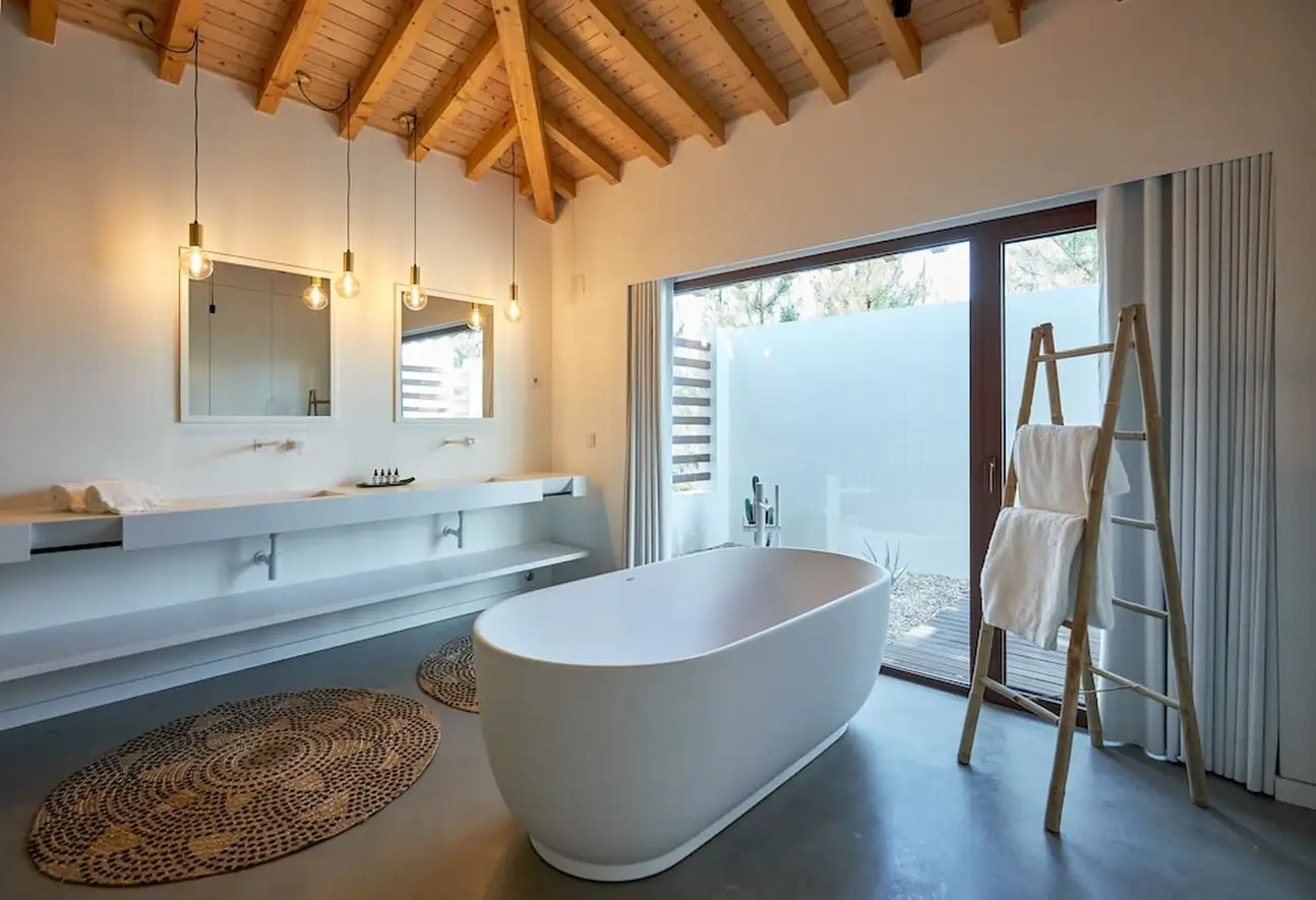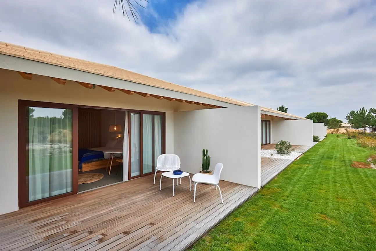 Moderne, intimiste et minimaliste, l’esprit des 20 chambres et villas a été pensé pour une relaxation intense. Tout n’est que bois et beige, dans un design épuré et harmonieux, avec des grandes baies vitrées ouvertes sur la nature. Les salles de bain sont canons avec leur sol en béton ciré gris souris et leur déco inspirée de l’élégance nippone. Vous y trouverez de grandes vasques grises, des portes en treillis boisé clair et une symétrie parfaite. Même le design de la bouilloire est canon, noir laqué avec son manche en bois. Dans les chambres doubles de 20 m², on kiffe les hamacs sur les terrasses, l’osier et les tissages qui donnent un aspect « handcraft » très sympa dans cette ambiance less is more, tout comme dans les suites de 70 m². Et pourquoi ne pas craquer pour une villa 2 ou 3 chambres, de 150 à 200 m², avec piscine privée ? Vous allez adorer leur baignoire arrondie au beau milieu de la salle de bain... Sans oublier a cuisine ouverte bien-sûr et son bar blanc immaculé, idéal pour refaire le monde avec un bon verre de vin de l’Alentejo !