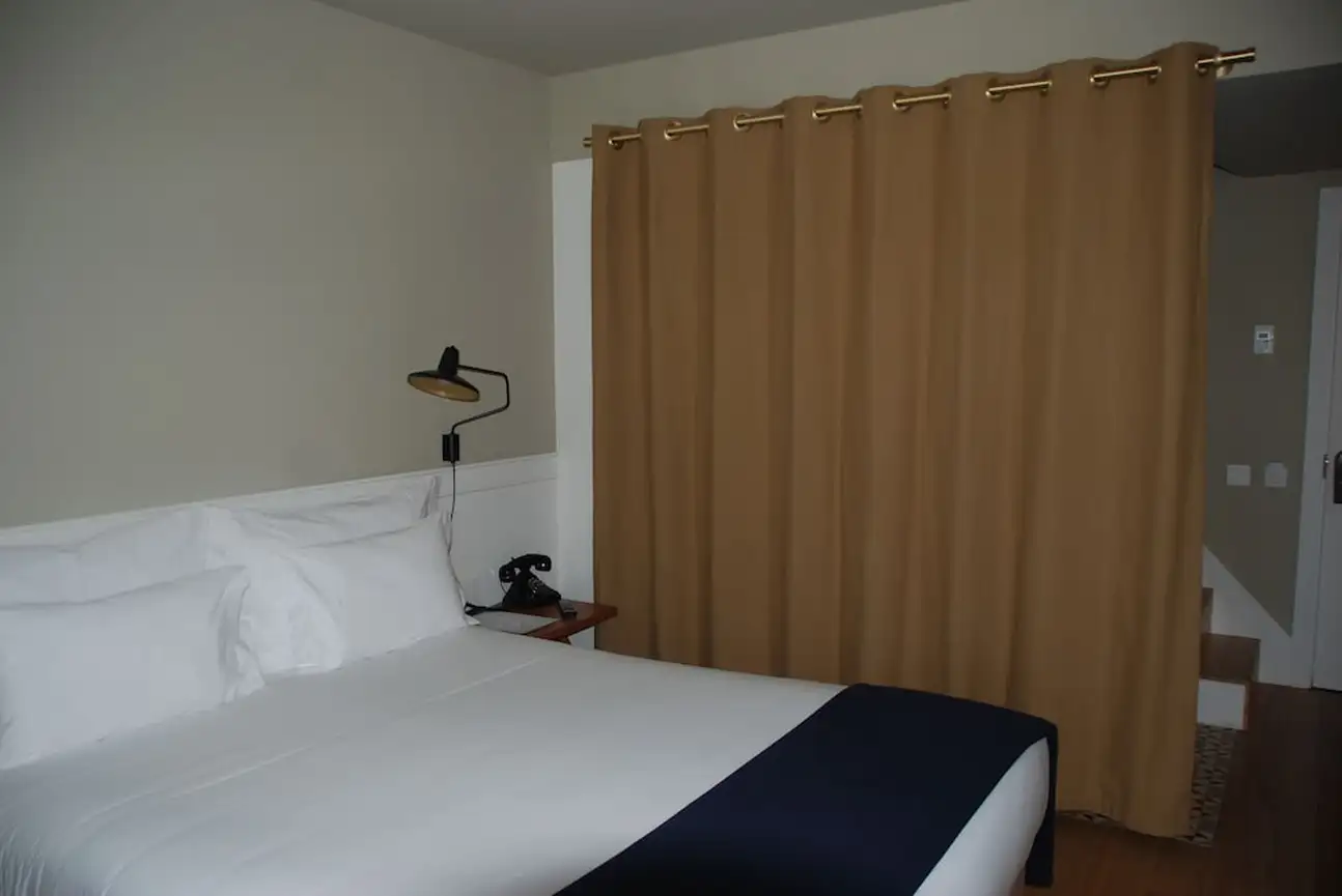 Parquet foncé au sol, volets intérieurs, mobilier et tapis chinés, douceurs des tonalités et des éclairages : votre chambre est un cocon dans la ville. Avec des vues et points de vue sur Porto, uniques. Quant aux clins d'œil au passé, ils vont jusqu'au téléphone : un appreil filaire, à cadran. Un autre monde !