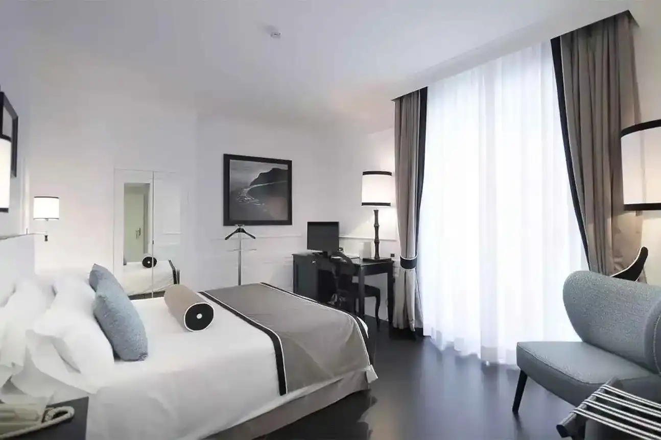 À l’arrière du vaste lobby, un piano-bar, un salon en mezzanine permet d’observer la rue. Au dernier étage, un bar intime et le restaurant se prolongent sur une véranda avec vue panoramique sur la ville.