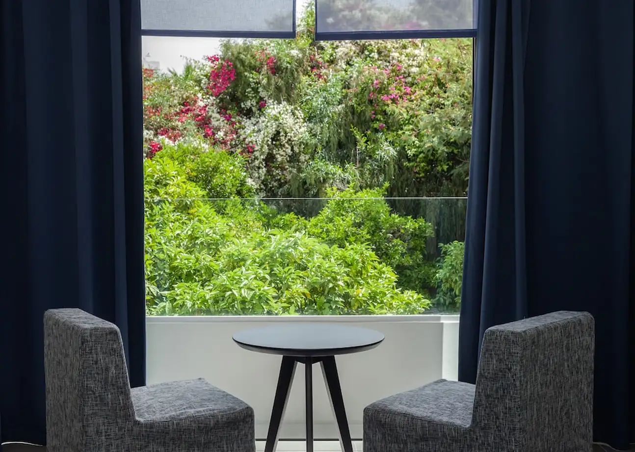 Le concept Less is more résume parfaitement le décor des 187 chambres de l’Almyra. Du blanc, du bleu, des lignes pures, un mobilier design, des matériaux naturels, avec de larges baies vitrées laissant entrer la lumière méditerranéenne, côté mer ou côté jardin. Vous aimerez en particulier les terrasses sur les toits des suites Kyma, équipées de grandes banquettes où il fait bon paresser en regardant et en écoutant la mer. Un véritable shot de bleu qui vous en mettra plein les yeux. Wifi gratuit dans tous les espaces !