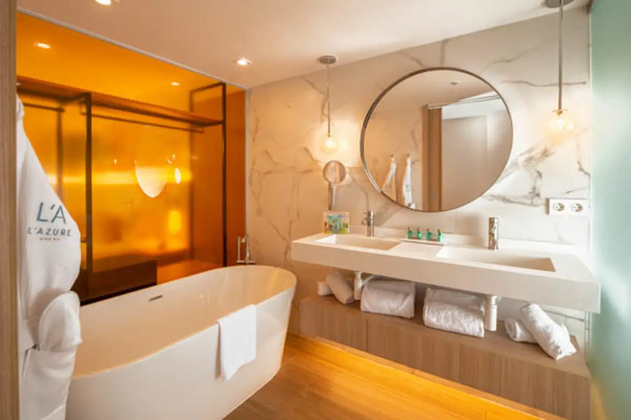 - Suite famille vue piscine (44 m²) : mêmes équipements + 1 lit king size + salon avec canapé-lit + salle de bain avec douche et baignoire + balcon vue