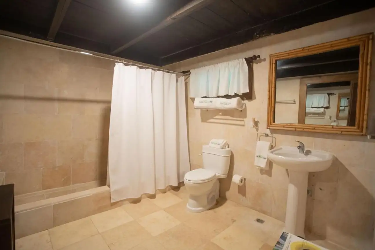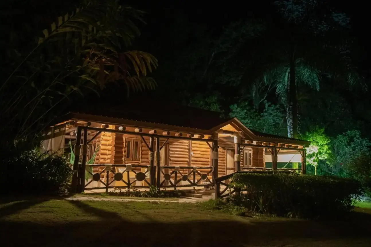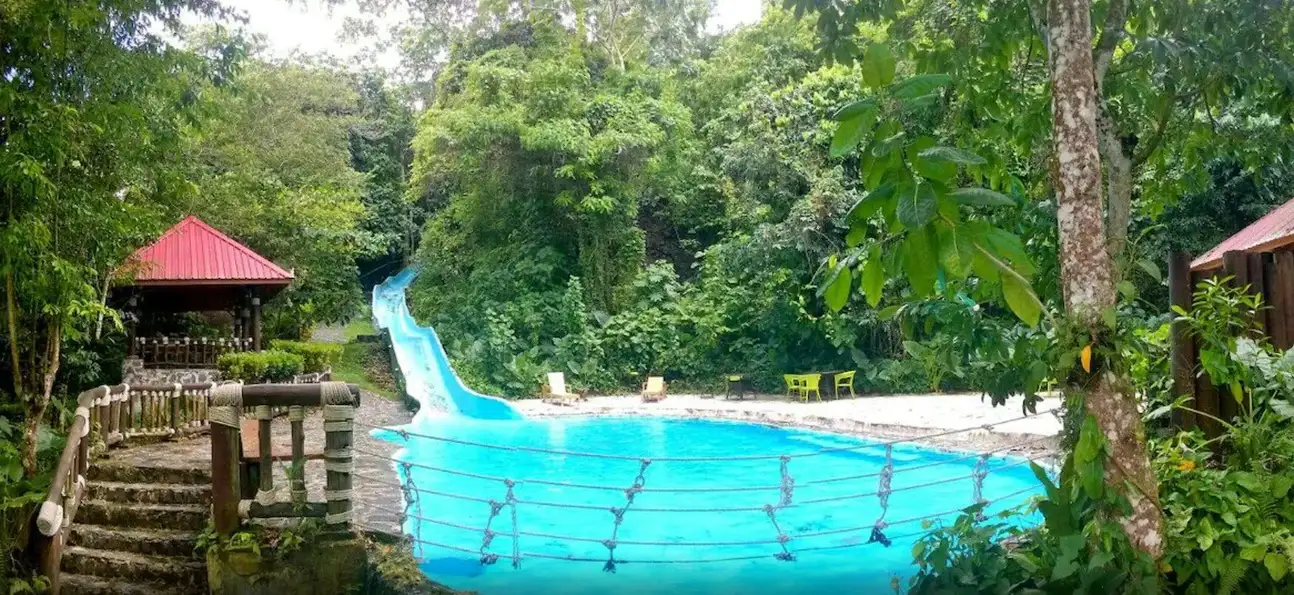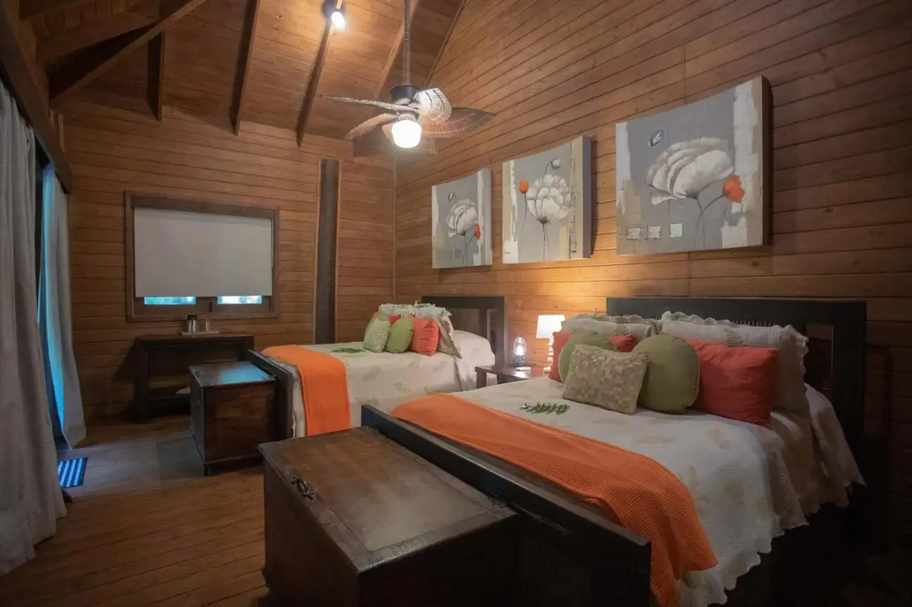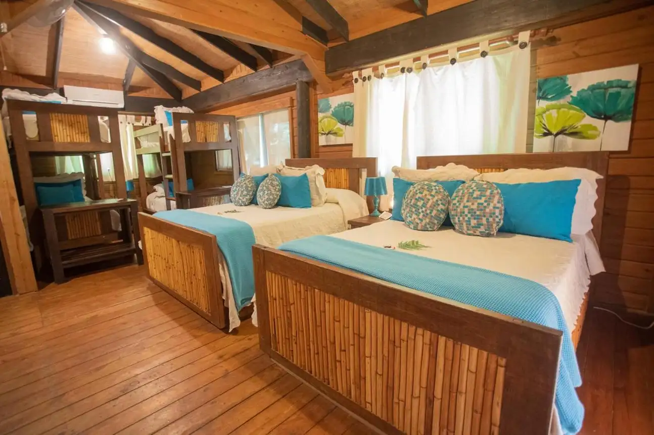 On accède par des sentiers dallés ou par des passerelles aux bungalows dispersés dans la végétation ou nichés dans les arbres. Leurs façades coquettes associent plusieurs essences de bois. Les balustrades sont liées par des cordes. Grâce au toit en aluzinc, de la tôle rouge revêtue d'aluminium-zinc, on entend le bruit de la pluie... Le matelas est de qualité, la literie est soignée, les couvre-lits en nid d’abeilles, les coussins brodés de perroquets multicolores. Il y a des canapés et des fauteuils en rotin. Et de petites salles de bain en bois. Les trois chambres du cottage Cascade, l'ancienne maison familiale, ont vue sur une chute d'eau alimentant une vasque. Celles de Trunk, de petits dortoirs, sont suspendues haut dans les arbres. La cabane Bambou est immergée dans une bambouseraie. Chaque chalet possède aussi un salon de séjour ou une salle de jeux, et une terrasse avec rocking-chair. Et sinon, pas vraiment de réseau web, pas de TV : déconnectez ! Ça tombe bien : il y a des hamacs, une cabane pour se réunir en famille, et la terrasse donne sur une vasque naturelle.
