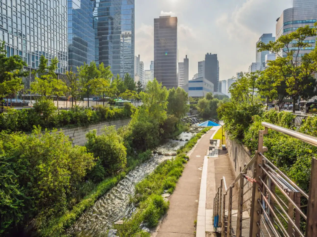 - Rivière Cheonggyecheon, veine verte du cœur de Séoul. Veine verte de la ville, Cheonggyecheon a subi de gigantesques travaux durant son histoire moderne. Initialement une petite rivière, elle devint un bidonville à la fin de la guerre de Corée. Complètement détruite, elle laissa la place à un périphérique routier suspendu dans les années 70 avant de retrouver sa forme semi-originelle dans un chantier qui dura près de 2 ans et coûta la bagatelle de 300 millions de USD.