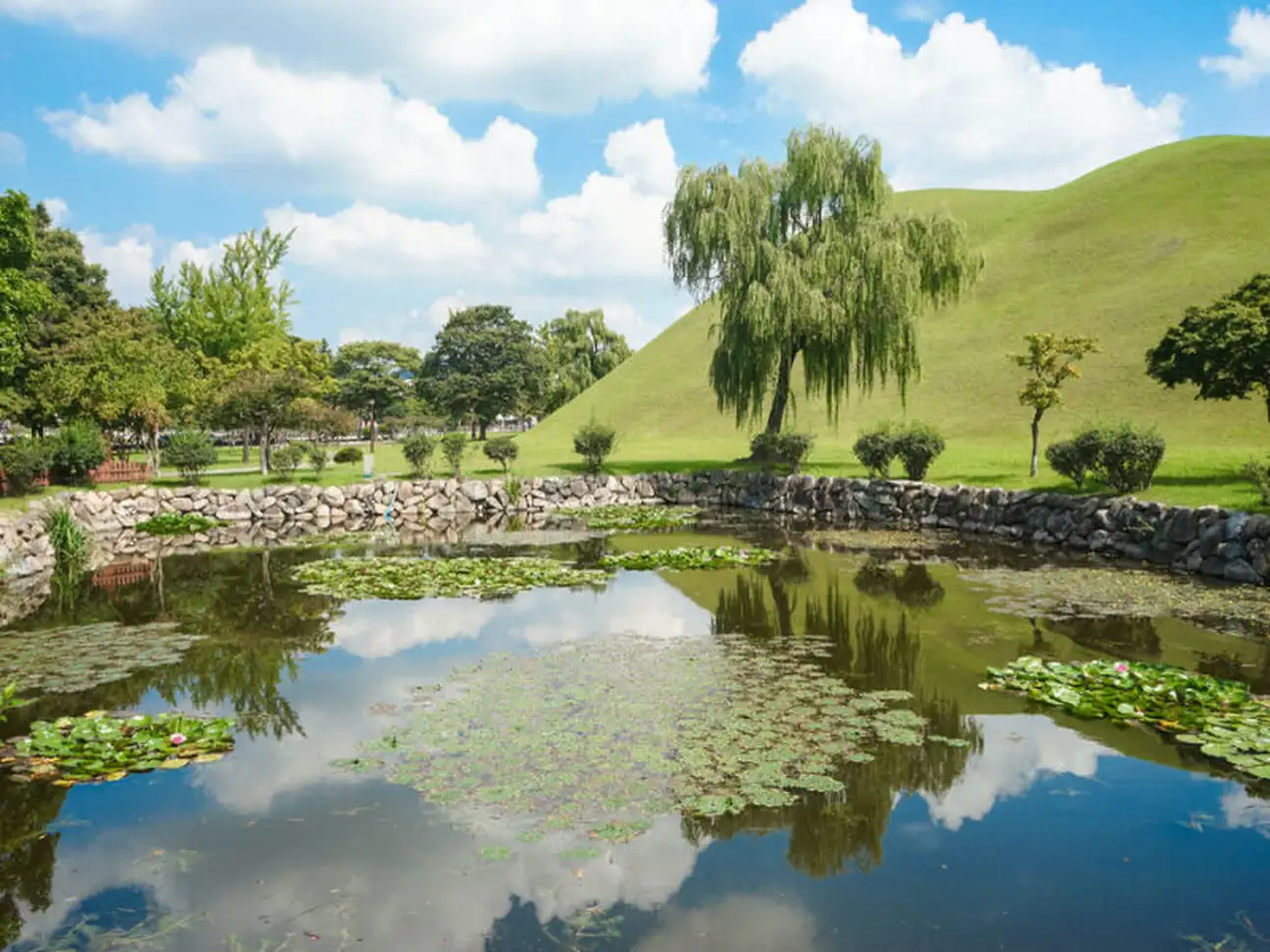 - Parc de Tumulis de Daereungwon (UNESCO). Ensemble de tombes royales et de hauts dignitaires, le parc regroupe la plus célèbre des tombes, celle du cheval céleste. Quasiment complète (contrairement à beaucoup d'autres tombeaux qui furent pillés au travers des siècles), celle-ci a permis de comprendre les rites funéraires sous la dynastie Silla (57 AV-JC - 935) mais aussi de découvrir de fabuleux artefacts dont une couronne en or pur et en jade ainsi que de nombreux éléments de la tenue royale d'apparat.