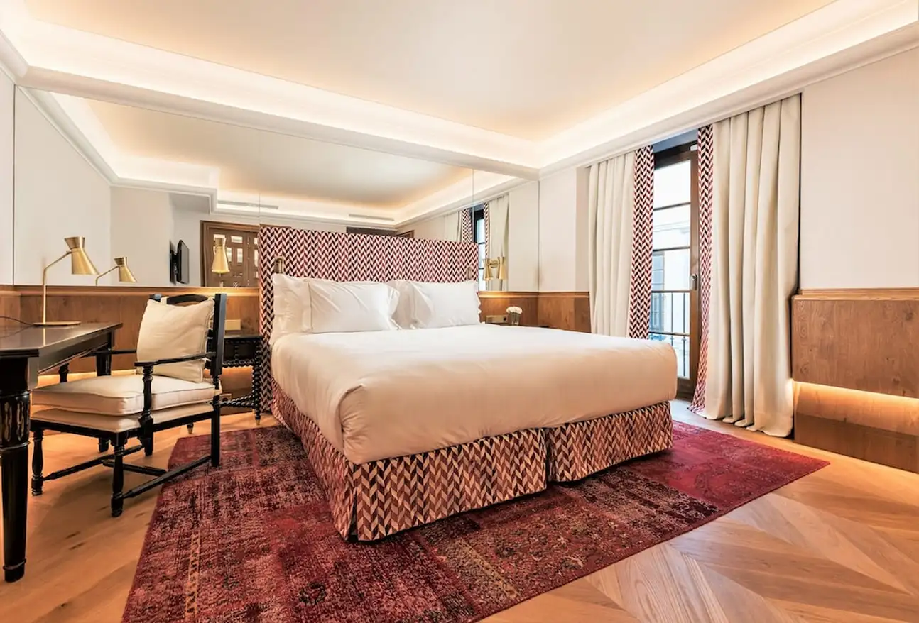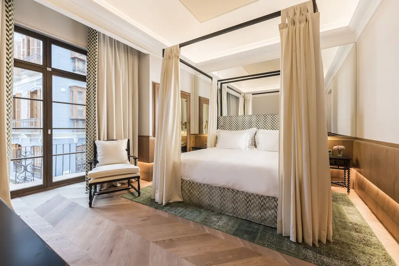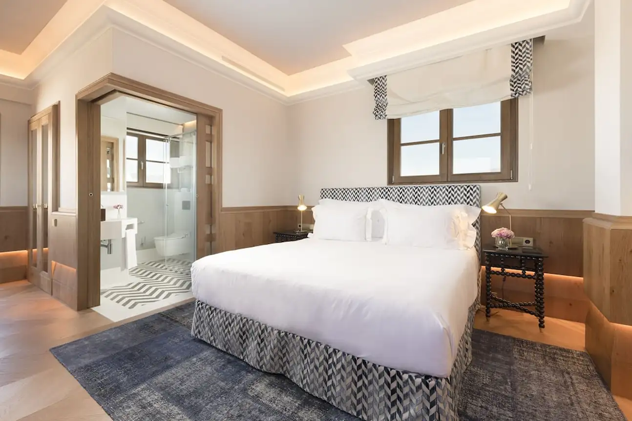 Poussez la porte en chêne et c’est un royaume de douceur qui vous attend dans votre chambre, ambiance andalouse contemporaine. On adore l’effet cocon entre le bois et les tissus, les meubles dépaysants so andalous, le parquet et les grandes fenêtres. Les 68 chambres sont organisées sur 4 étages autour de deux patios. Têtes de lit en velours, rideaux à chevrons, appliques en laiton, l’élégance règne. Et les salles de bain sont en marbre, avec un joli sol en chevron… Les chambres Doubles de 23 m² offrent déjà tout cela, mais si vous voulez plus d’espace, optez pour les Deluxe de 27 m² équipées de machines à café, ou pour les Deluxe Supérieures de 34 m2 avec leurs lits à baldaquins et grandes baignoires ! Les suites et les chambres familiales de 46 à 65 m² offrent des salons comfy avec d’élégants canapés beiges.