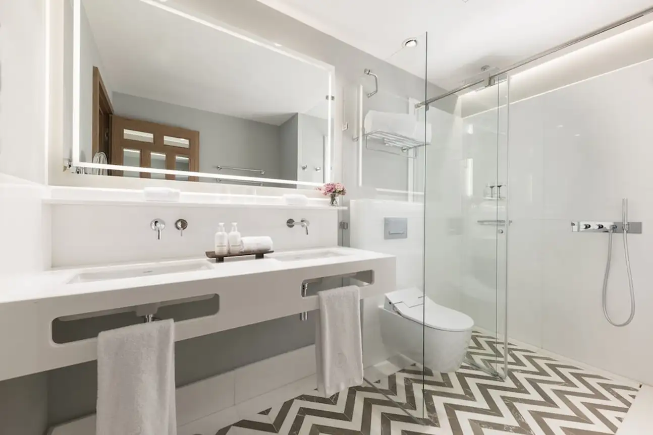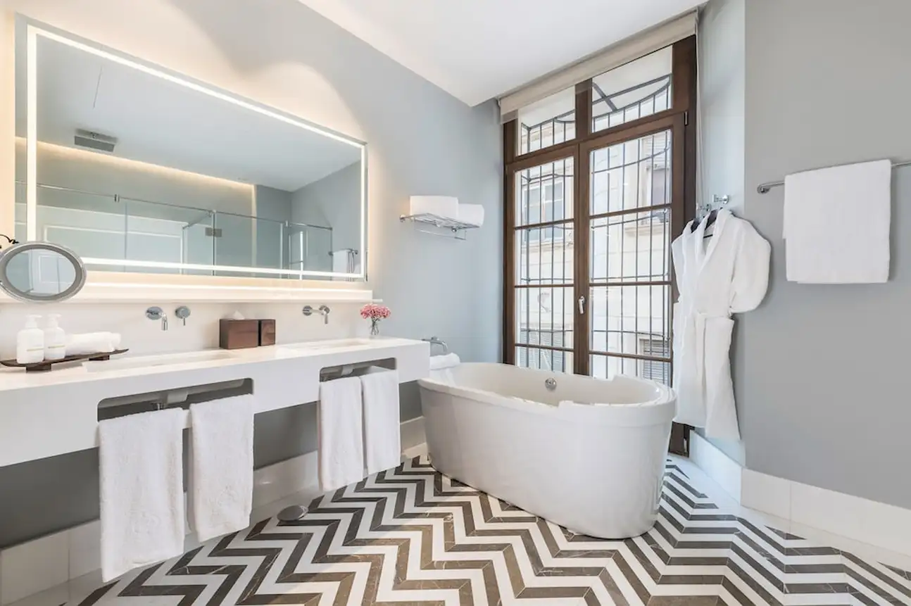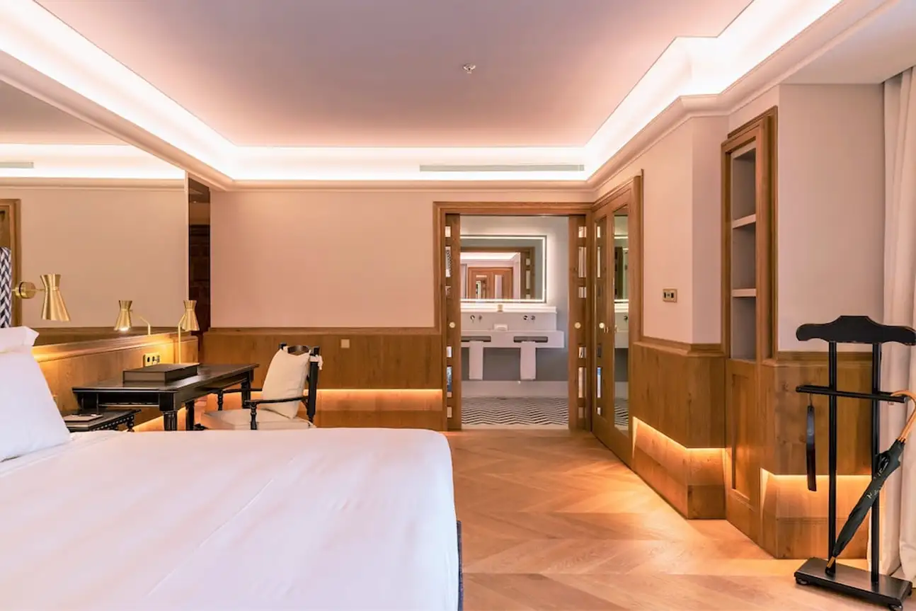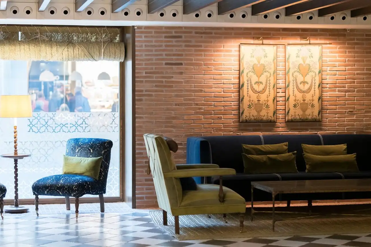 Poussez la porte en chêne et c’est un royaume de douceur qui vous attend dans votre chambre, ambiance andalouse contemporaine. On adore l’effet cocon entre le bois et les tissus, les meubles dépaysants so andalous, le parquet et les grandes fenêtres. Les 68 chambres sont organisées sur 4 étages autour de deux patios. Têtes de lit en velours, rideaux à chevrons, appliques en laiton, l’élégance règne. Et les salles de bain sont en marbre, avec un joli sol en chevron… Les chambres Doubles de 23 m² offrent déjà tout cela, mais si vous voulez plus d’espace, optez pour les Deluxe de 27 m² équipées de machines à café, ou pour les Deluxe Supérieures de 34 m2 avec leurs lits à baldaquins et grandes baignoires ! Les suites et les chambres familiales de 46 à 65 m² offrent des salons comfy avec d’élégants canapés beiges.