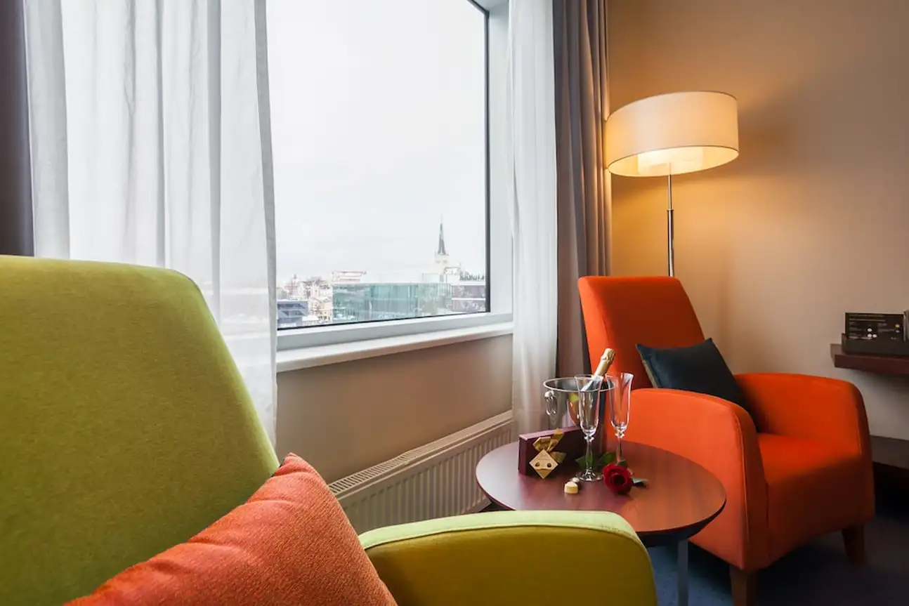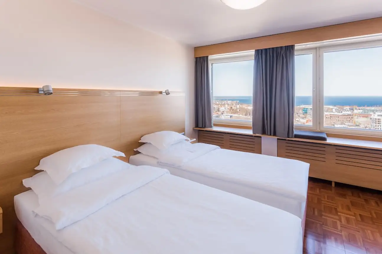 Disons-le tout de suite : on ne choisit pas cet hôtel pour la déco des chambres ! Car on est plutôt sur un style sobre et minimaliste, avec parfois quelques touches de couleurs dans un univers bois. Un peu old school, mais le confort est là. Les chambres Standard sont un peu petites avec 19 m2. Alors, pour être à l’aise, on vous conseille la chambre Supérieure de 23 m2, avec sa grande entrée et sa vue géniale sur Tallinn et la mer. En famille, vous pouvez compter sur les chambres familiales avec leurs lits superposés colorés. Ou sur les suites, qui offrent le meilleur panorama sur la ville et un sauna dans la salle de bain !