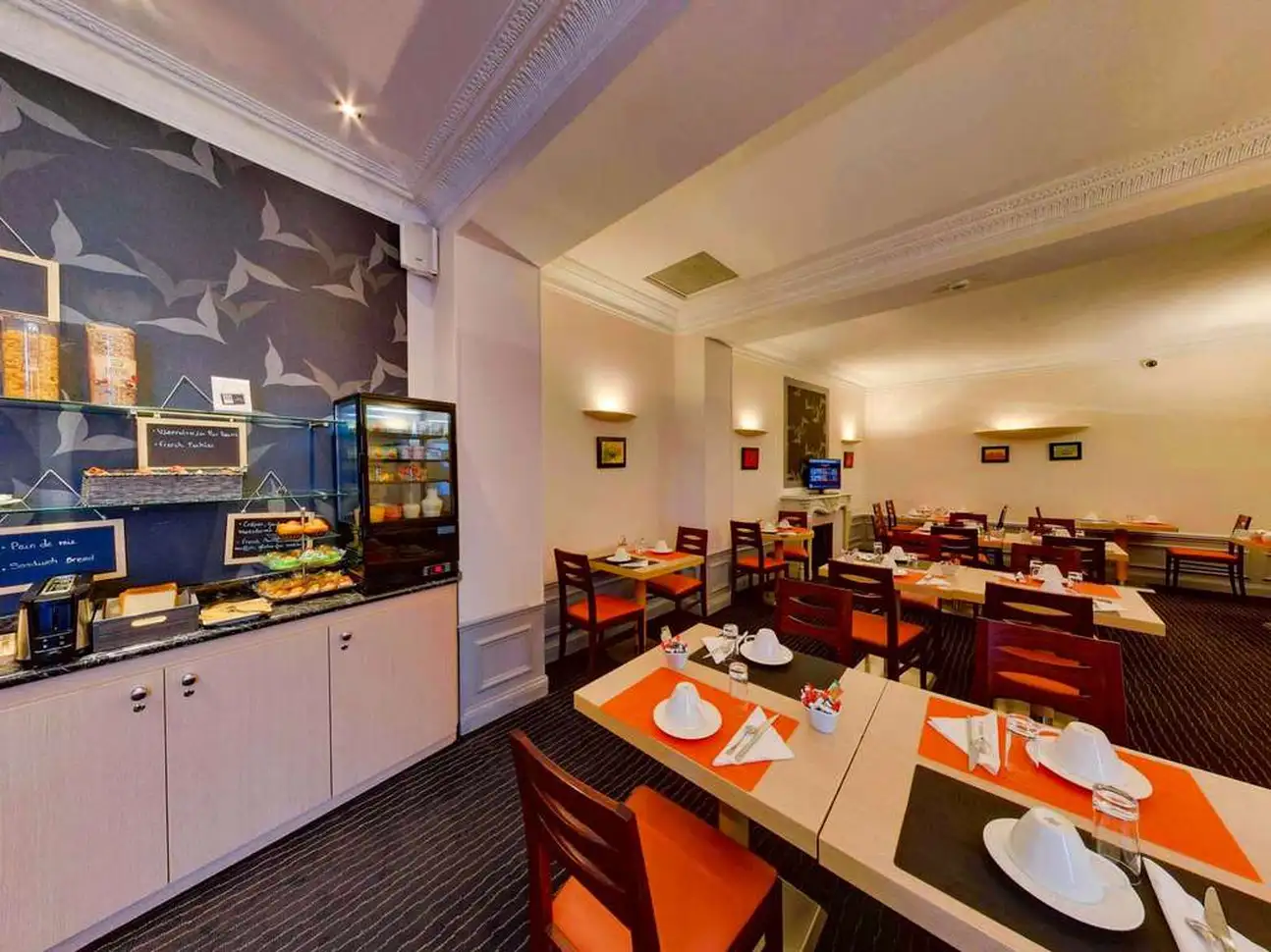 Découvrez ensuite les charmes d'une salle à manger au style classique pour savourer un petit-déjeuner de qualité. Avec une splendide cheminée en marbre et un ascenseur authentique doté de vitraux et d'une structure en bois, l'atmosphère unique de notre établissement ne vous laissera pas indifférent.