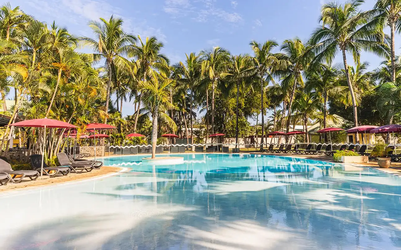 Le petit-déjeuner buffet servi en face de la piscine propose un large choix de viennoiseries, charcuteries et fromages ainsi que des spécialités locales.