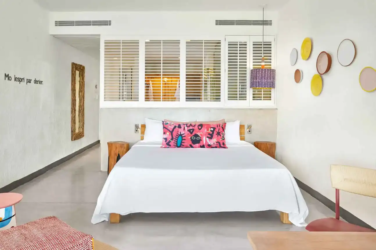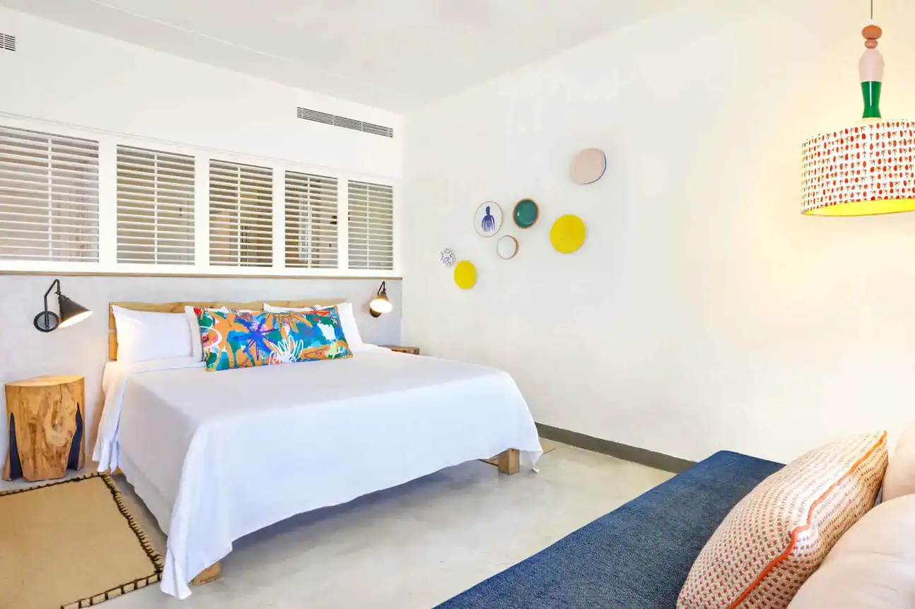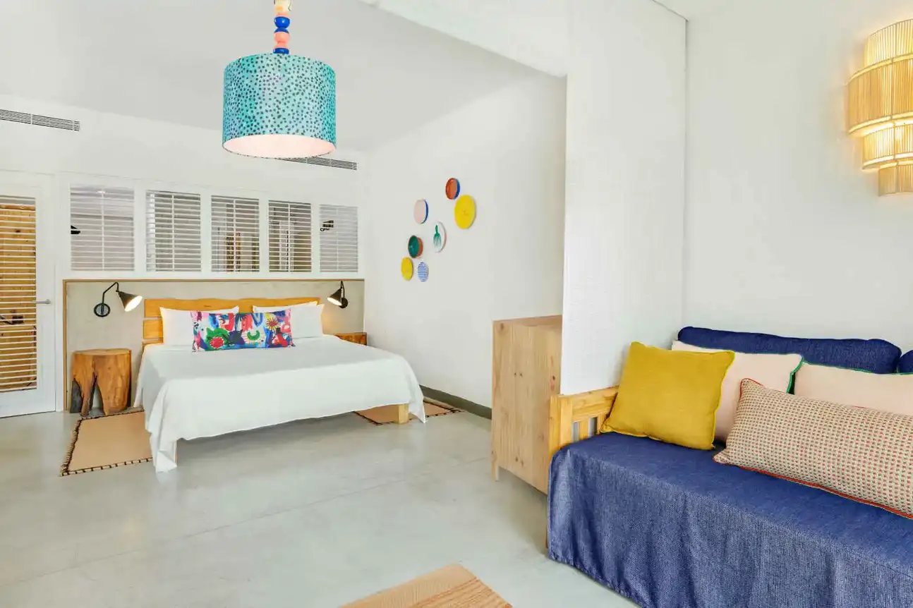 - Suite junior couple : Située en front de mer, cette suite de 50 m² est dédiée aux couples en voyage de noces ou tout simplement en escapade romantique pour se retrouver. Elle séduit par sa luminosité, sublimée par des touches colorées et des matières naturelles qui insufflent une atmosphère décontractée. Le mobilier en bois brut, les textiles vifs et les détails artisanaux apportent une touche de caractère.