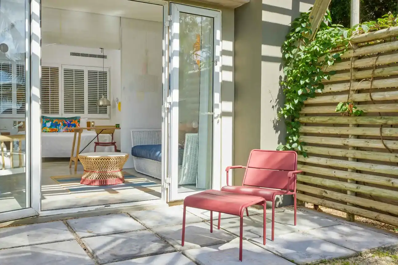 La terrasse aménagée avec fauteuil et table basse prolonge l’espace de vie en extérieur avec vue imprenable sur les jardins. Engagé en faveur d’un tourisme plus responsable, l’établissement exclut tout plastique à usage unique et propose une boutique en vrac pour composer son minibar selon ses envies.