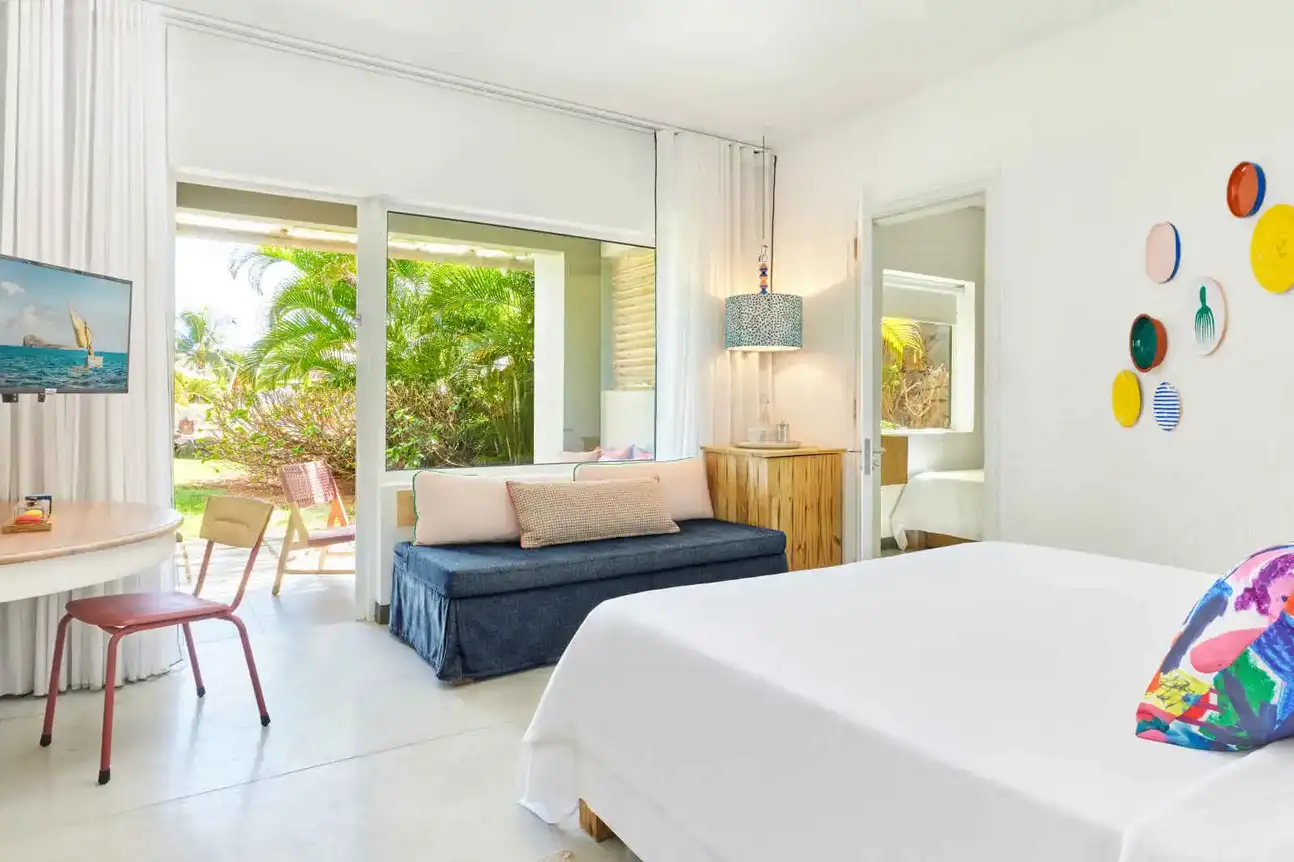 - Chambre couple deluxe : Donnant sur le jardin luxuriant ou sur la plage avec vu mer partielle, cette chambre couple de 40 m², prévue pour 2 personnes, séduit par sa luminosité sublimée par des touches colorées et des matières naturelles qui insufflent une atmosphère décontractée. Le mobilier en bois brut, les textiles vifs et les détails artisanaux apportent une touche de caractère.