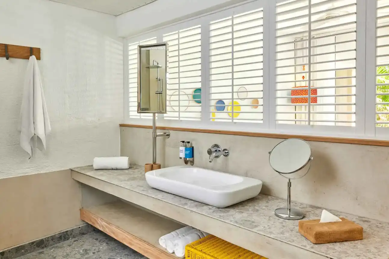 - Suite privilège couple : Délicatement posée en front de mer, cette suite de 40 m²est le havre parfait pour une robinsonnade en lune de miel ou des vacances en amoureux. Conçue pour accueillir jusqu’à 2 personnes, elle séduit par sa luminosité, sublimée par des touches colorées et des matières naturelles qui créent une atmosphère décontractée. Le mobilier en bois brut, les textiles vifs et les détails artisanaux apportent une touche de caractère et de charme.