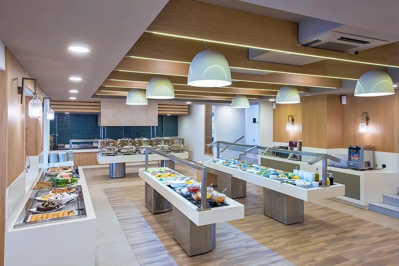 - Boissons locales et internationales : ouzo, raki, brandy local, vin au verre, bière pression, boissons non alcoolisées, café filtre, cocktails alcoolisés ou non, chocolats chauds, cappuccino, café latte et une variété de thés.