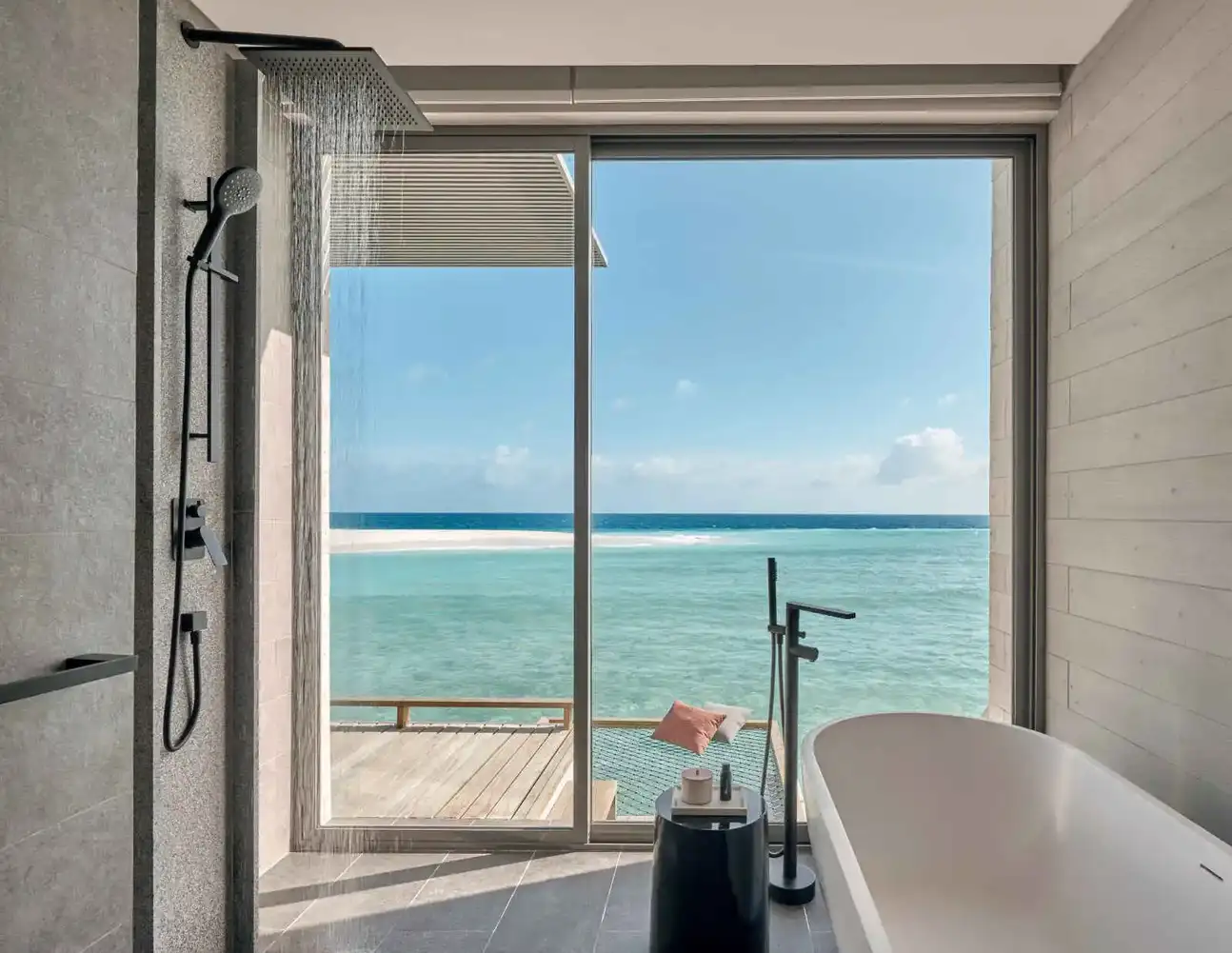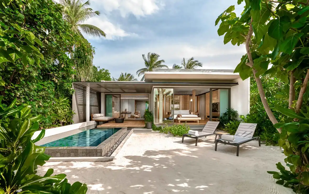 - Villa plage avec piscine - lever de soleil : Orientée vers le lever du soleil, cette villa est aux premières loges pour assister quotidiennement au spectacle extatique de l’ascension d’Hélios dans le ciel pur des Maldives. Avec son design contemporain, elle reçoit majestueusement ses hôtes (3 adultes ou 2 adultes et 2 enfants) dans un écrin de 202 m². Idéalement située face à l’océan Indien avec un accès direct à la plage, elle s'ouvre sur l'extérieur tout en préservant l'intimité grâce aux allées verdoyantes qui la bordent, créant ainsi de véritables havres de paix. La chambre principale, dotée de grandes portes-fenêtres coulissantes du sol au plafond, laisse pénétrer une la lumière et s’ouvre sur la terrasse. Le salon séparé dispose d'un mini-bar, d'un canapé et d'un espace télévision.