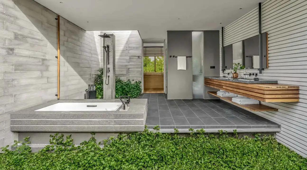 La vaste salle de bains semi-ouverte se prolonge sur une cour arrière verdoyante avec une grande baignoire et une douche extérieure. Elle est également équipée d'une double vasque et d'un WC séparé. Devant la villa, la terrasse en bois, partiellement ombragée par la toiture, propose un véritable salon extérieur avec canapé, une magnifique piscine à débordement et des lits de plage individuels avec parasol. Ce cadre idyllique permet de profiter pleinement d’un cadre exceptionnel en toute intimité.