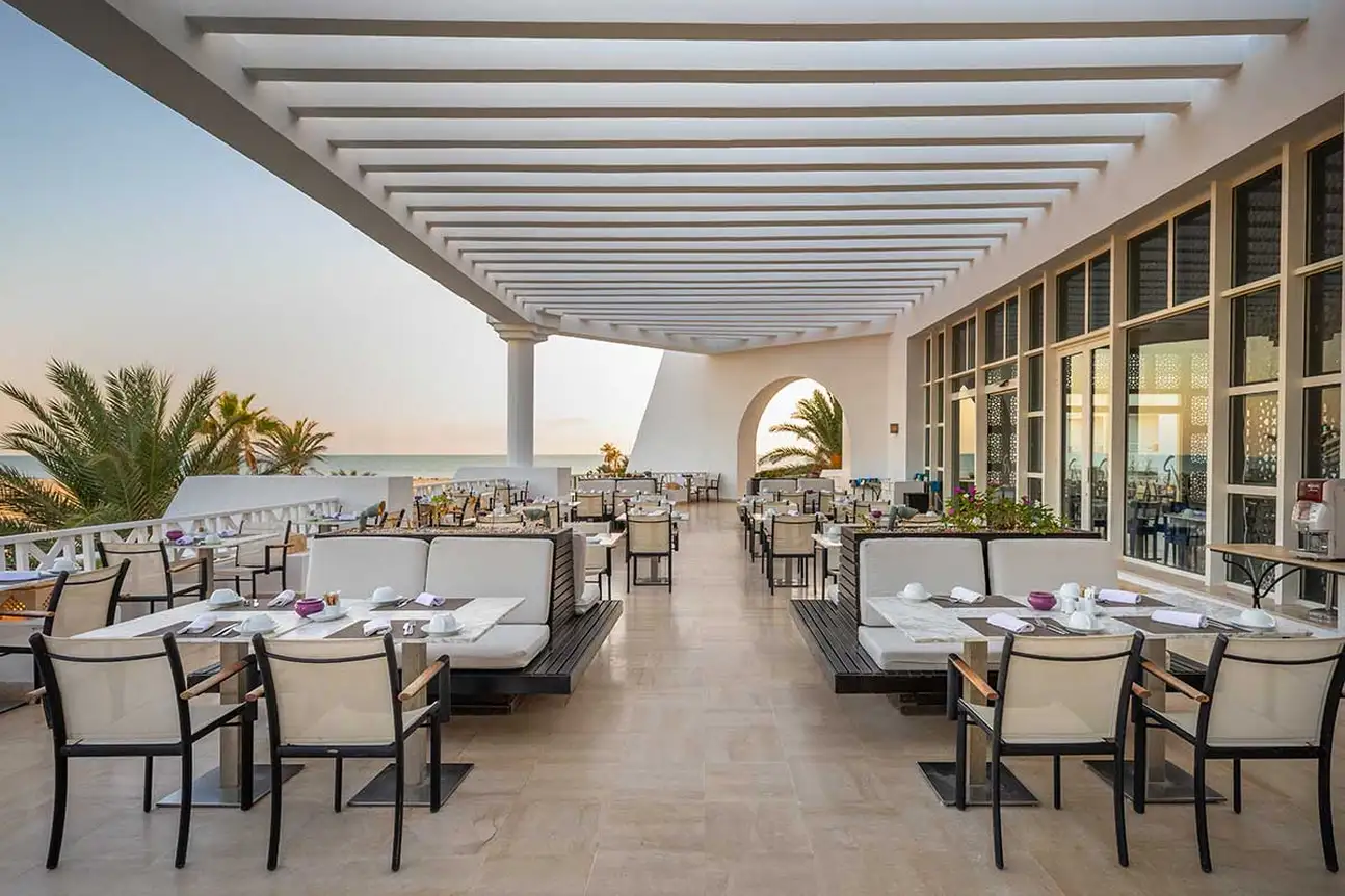 Restaurant principal "le Céramique" sous forme de buffet avec une partie en terrasse pour le petit-déjeuner, 3 restaurants à la carte, snack, 5 bars dont un en bord de plage.