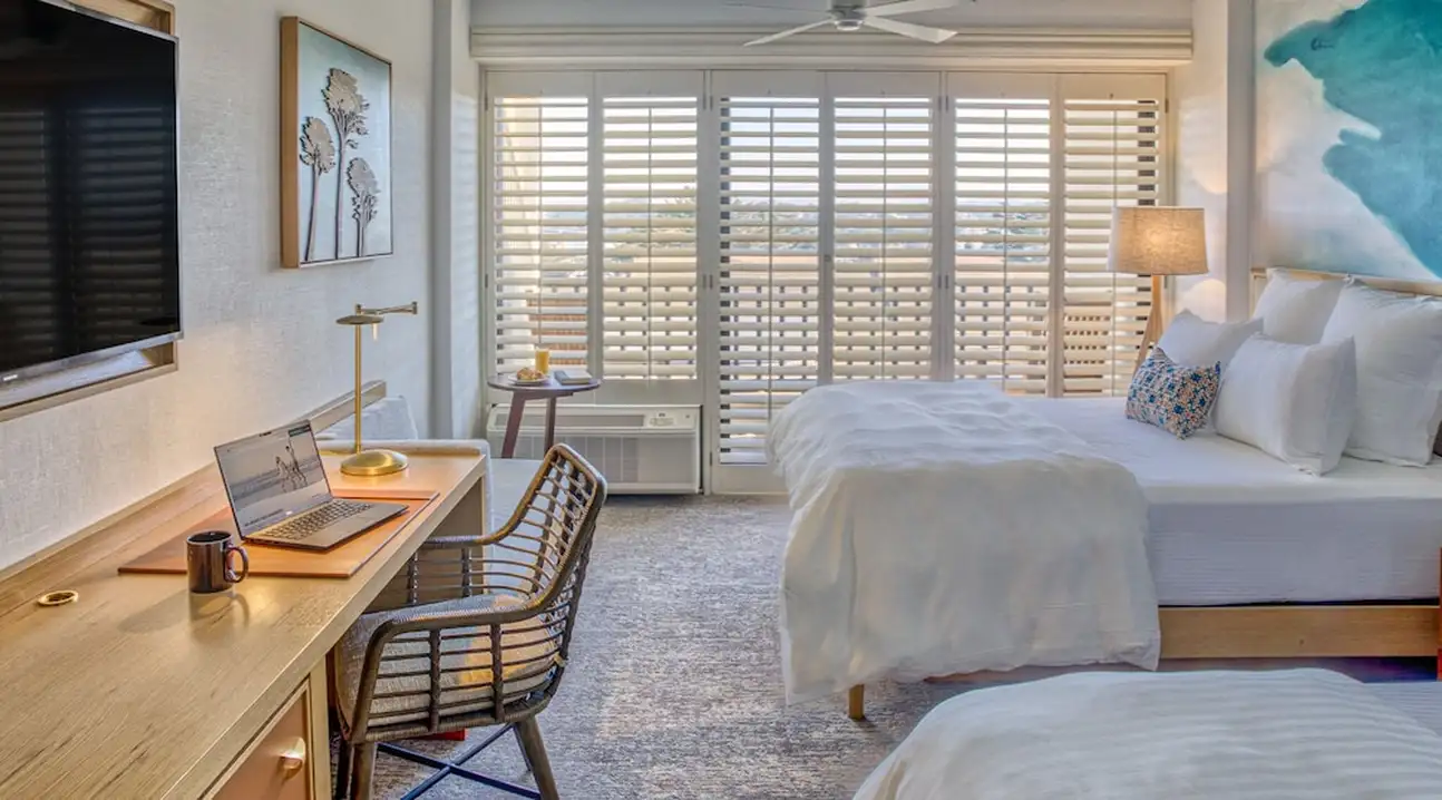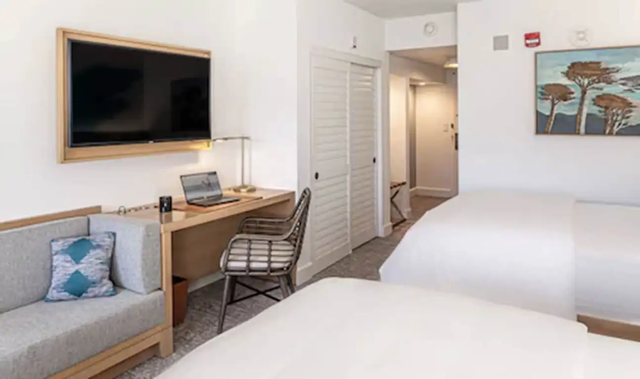 Avec 379 chambres grandement inspirées par la côte californienne, préparez-vous à un séjour ensoleillé. Entre ses vagues abstraites aux murs et ses tons blanc cassé-bleu turquoise, les chambres Portola (31 m²) apportent une touche chic appréciable. Attendez-vous à une cafetière, un écran plat, des prises USB, des têtes de lit à éclairage intégré et forcément, un ventilateur au plafond. Les baies vitrées coulissantes permettent quant à elles d’apprécier le son des vagues. Et si vous souhaitez faire plus qu’apprécier leur son, laissez-vous tenter par le Studio (41 m²), muni d’un coin-salon et d’un balcon, avec vue sur la baie ou la piscine. Enfin, les suites (entre 55 et 90 m²) offrent un mobilier bien plus contemporain ainsi qu’une vue bien plus dégagée, étant situées dans les étages supérieurs.