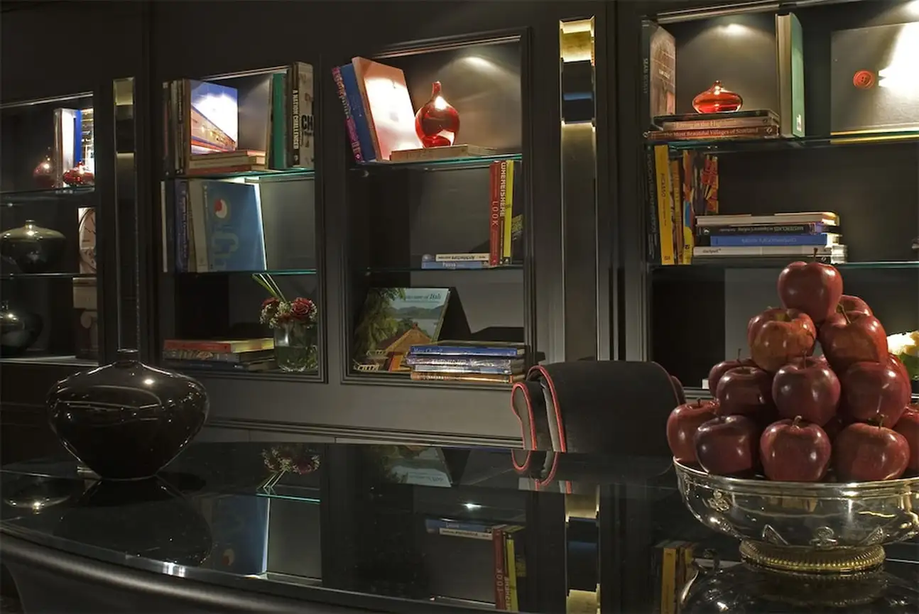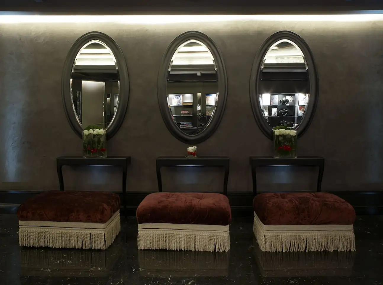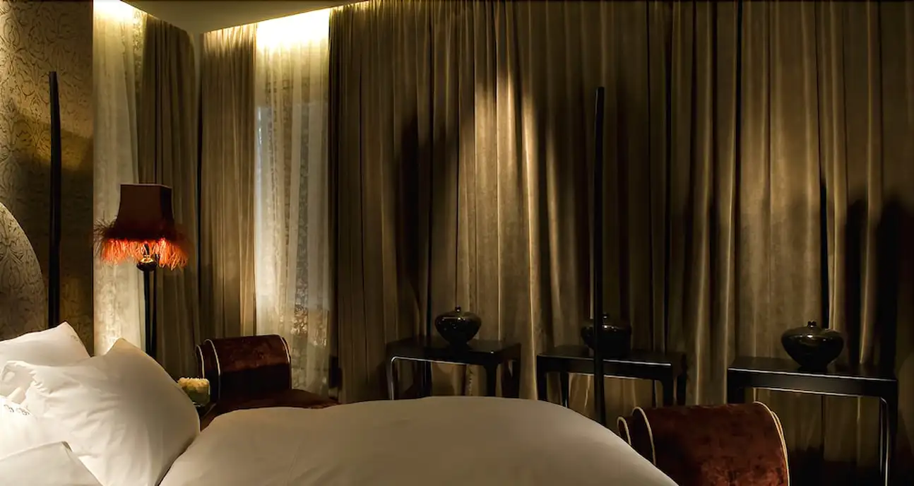 Immersion dans une ambiance qui allie charme de l’Art Déco à la coquetterie boudoir-chic. Vous avez l’impression qu’à chaque instant l’hôtel se transforme en décor de bal masqué. Partout vous trouvez cette ambiance boudoir aux lumières tamisées, velours et plumes. Le comptoir du bar, tout noir tout lisse est impressionnant. Sur le plafond et les murs : des miroirs qui multiplient cette ambiance intime. Plus coquet c’est interdit ! Envie de vous détendre ? Vous pouvez commander un massage en chambre.