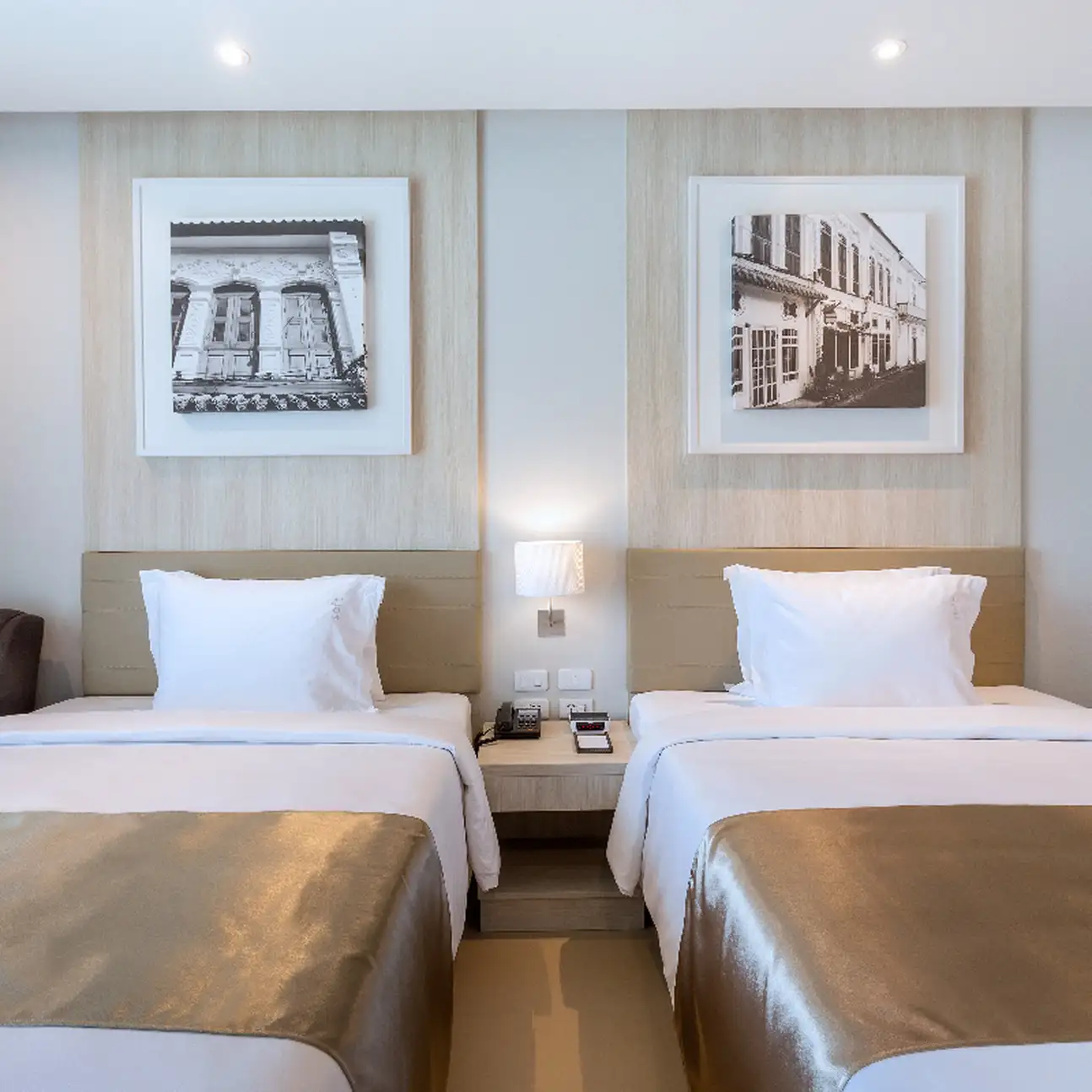 Dans le cadre d'une chambre à usage triple ou quadruple, vous serez logés en chambre double équipée de 2 lits twins (largeur 140cm environ).