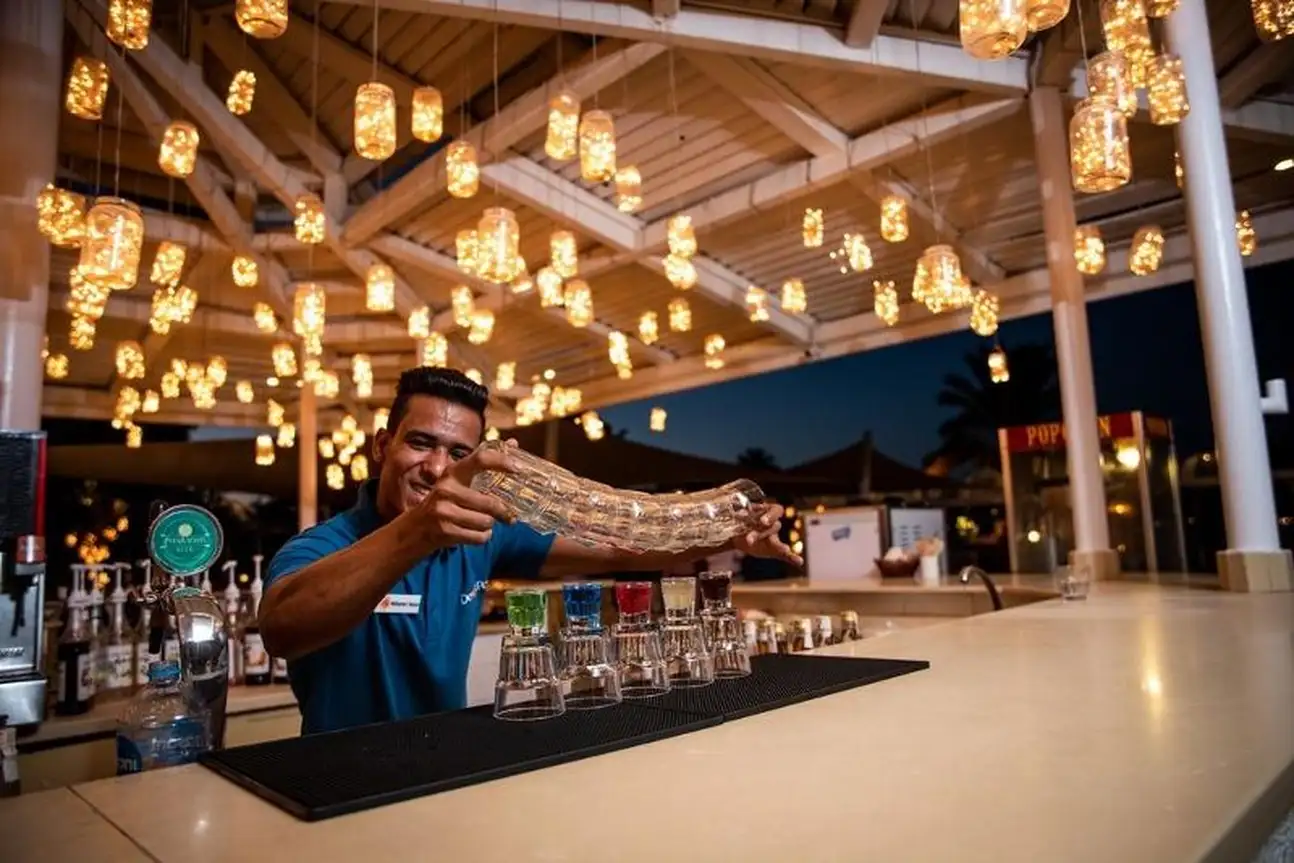 Cinq restaurants et 11 bars, les clients n'ont que l'embarras du choix ! Le restaurant principal de l'hôtel, The Palm, est un restaurant buffet ouvert servant une délicieuse cuisine du monde. Les quatre autres restaurants sont à la carte et sur réservation. La Dolce Vita offre une cuisine italienne somptueuse (payant), Fattoosh sert des spécialités traditionnelles locales, El Ranchero est spécialisé dans la cuisine mexicaine et Il Delfino est un superbe restaurant de bord de mer avec une cuisine ouverte. Ce dernier est vraiment agréable et est notre préféré. Hors de l'hôtel, on y accède par deux ponts et on a vraiment l'impression d'être hors de l'hôtel. On retrouve sinon un large choix de 11 bars, dont un bar à chicha, un pub et plusieurs bars en plein air.