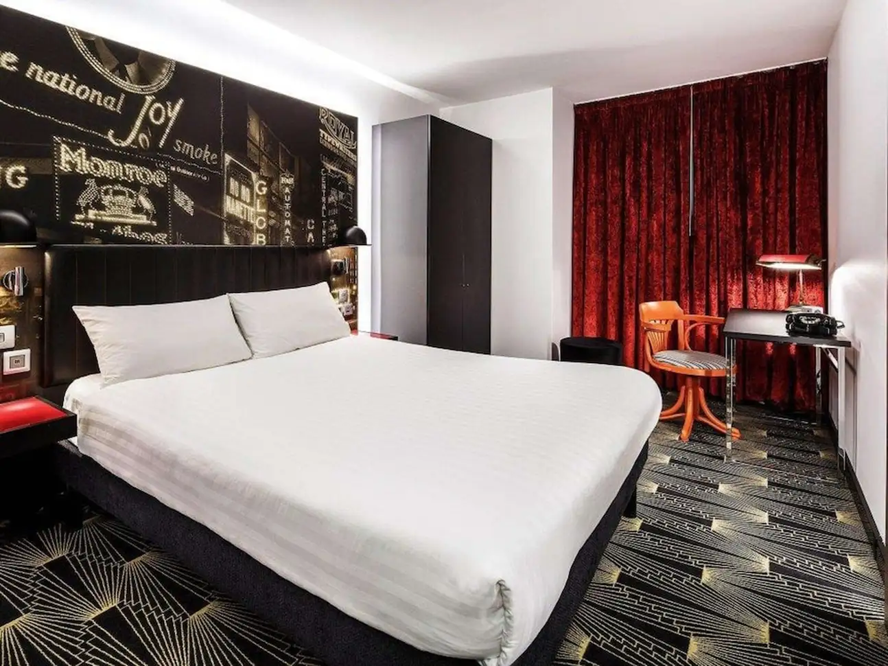 Ce qui est chouette à l’Ibis Styles London Southwark, c’est aussi sa déco originale. Les 154 chambres et les suites arborent tous un design modern où le gris domine, avec des touches singulières qui viennent rehausser le tout – comme le pan mur façon arc-en-ciel, les lampes en forme de chapeau melon, ou encore la paroi de la salle de bain où s'étend une rimambelle de notes de musique. À noter : la douche carrelée à l’italienne est dotée de jets hydromassants, plutôt cool pour se délasser la couenne après une bonne journée de vadrouille. Mais qu’est ce qu’on a de bon comme options ? La chambre The Queen (12 m²) a l’avantage d’avoir un grand lit queen size, comme son nom l'indique. Sinon, il y a The Duet, c'est-à-dire la même mais avec deux lits simples. Vous voulez plus d’espace ? Alors prenez la standard, avec lit queen size là aussi, mais un espace de 17 m². Bon à savoir : il existe une version conçue pour les voyageurs handicapés (24 m²). Enfin, il y a la suite de 25m² avec lit queen size à nouveau, mais aussi un canapé lit en prime.