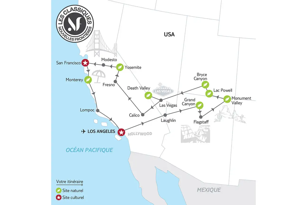 A vous les grands espaces de l'Ouest mythique ! Cet itinéraire classique, préféré par les voyageurs, vous permet de vivre pleinement le mythe de l'Ouest américain. Profitez de la douceur de vivre des villes en bordure du Pacifique. Découvrez les contrastes de l'incroyable ville de Las Vegas. Traversez les déserts pour rejoindre les hauts plateaux et admirer la réserve des indiens navajo ainsi que les parcs nationaux célèbres comme le Grand Canyon, Bryce, Yosemite...