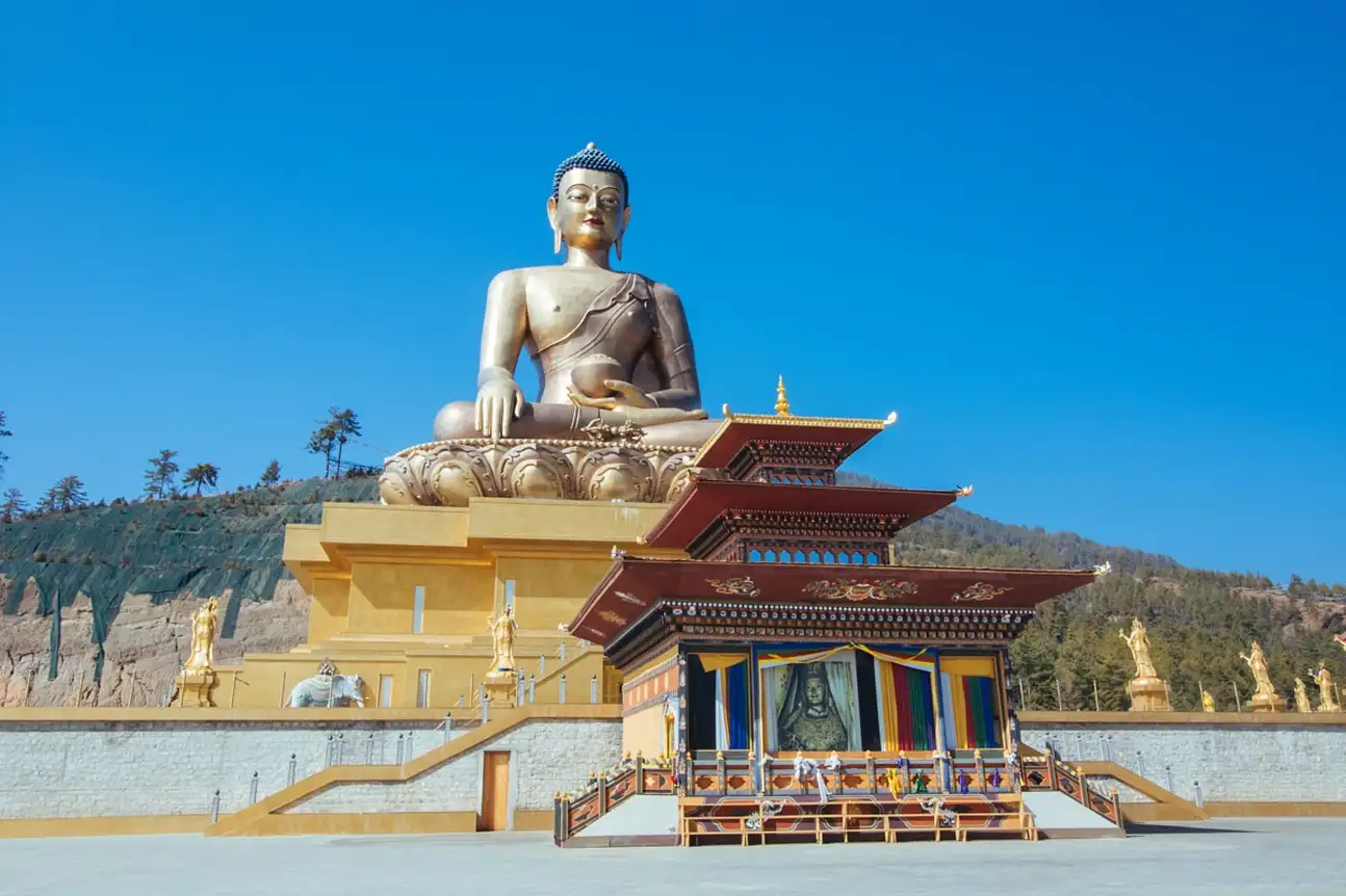 Départ jusqu'à Buddha Dordenma, situé au sommet d'une colline, cette statue massive de Shakyamuni en bronze et dorée à l'or, mesure 51,5 mètres de hauteur, ce qui en fait l'une des plus grandes statues du Bhoutan. Profitez du superbe point de vue sur la vallée de Thimphou.