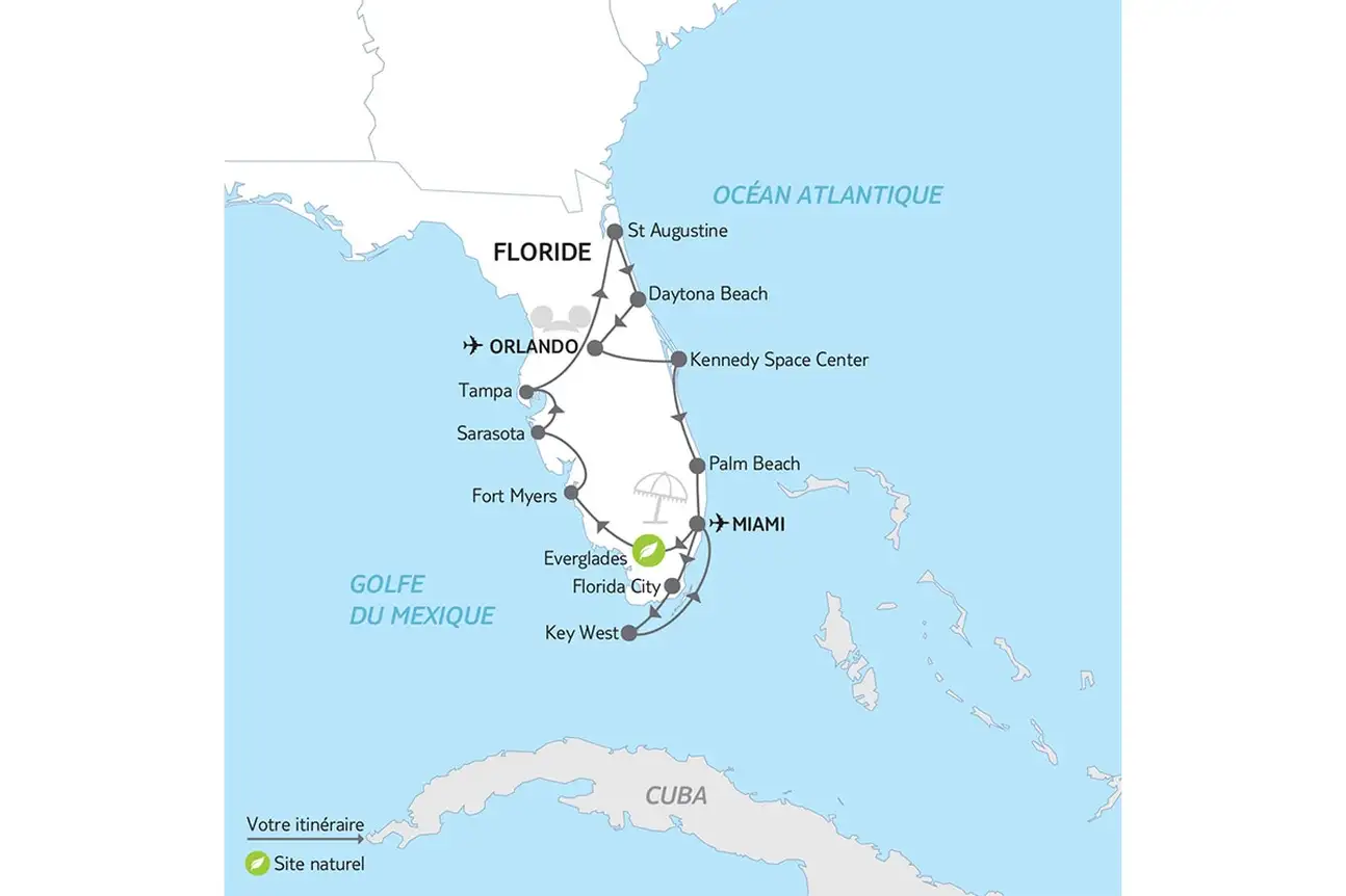 Puis, visite guidée panoramique de Miami : découverte de Downtown (centre-ville) et ses superbes gratte-ciels de verre et d’acier ; le quartier de Wynwood qui abrite quelques-unes des plus belles œuvres d’art urbain – notamment des "murals" – au monde ; l’élégante Coral Gables, un secteur de villas néo-méditerranéennes où vivent des stars du show-biz ; Little Havana, où vous rencontrez le visage latino-cubain de Miami ; le Miami branché et animé qui se dévoile à Miami Beach ; la luxuriance tropicale longeant la célèbre Ocean Drive, avenue immortalisée dans les séries TV avec son alignement d'hôtels Art Déco aux néons multicolores, dans le quartier de South Beach.
