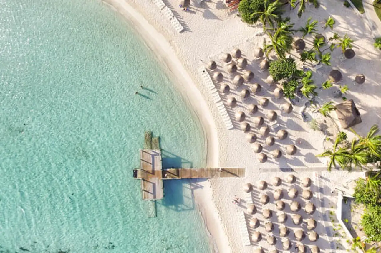 - Plage de sable blanc en accès direct aménagée de chaises longues et parasols.