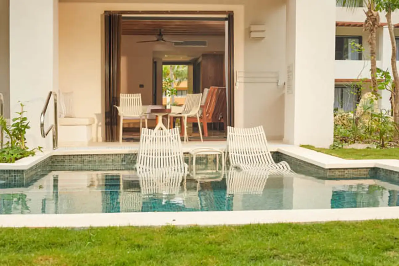 - Suite junior deluxe swim up (45 m²) : totalement rénovée, mêmes équipements, salle de bain avec douche + accès direct à la piscine. Capacité maximum : 3 adultes + 1 enfant, ou 2 adultes + 2 enfants.