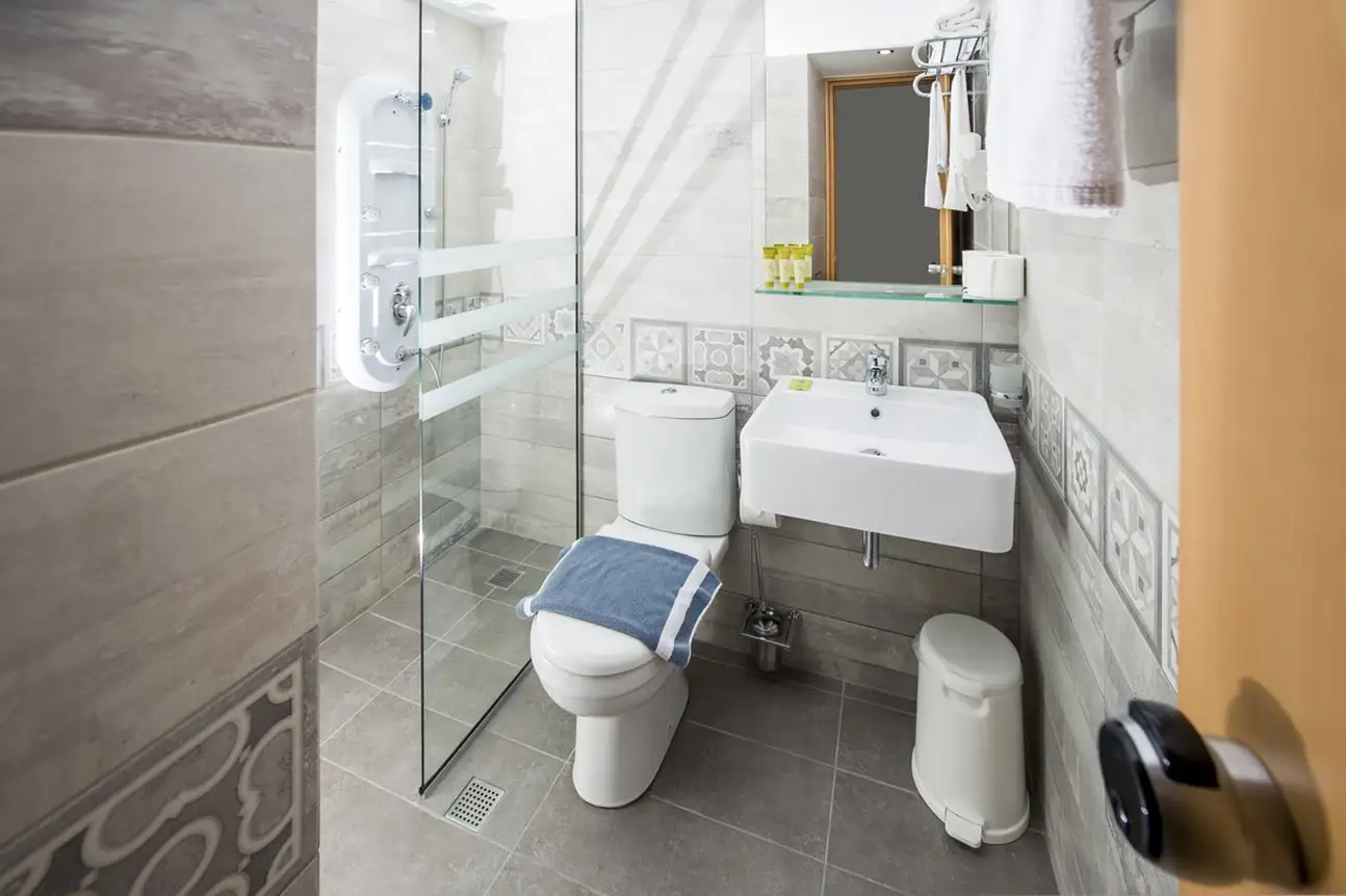 • Salle de bains avec douche balnéo ou baignoire et sèche-cheveux