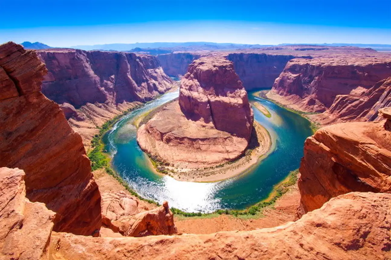Page est votre point de départ pour le lac Powell, un lac artificiel créé par le barrage du fleuve Colorado. Vous pourrez explorer à proximité Antelope Canyon et Horseshoe Bend, un canyon en forme de fer à cheval formé par le fleuve Colorado. Le point de vue se trouve à 1 280 mètres et le fleuve Colorado à 975 mètres au-dessus du niveau de la mer, ce qui représente une chute de 305 mètres à couper le souffle.