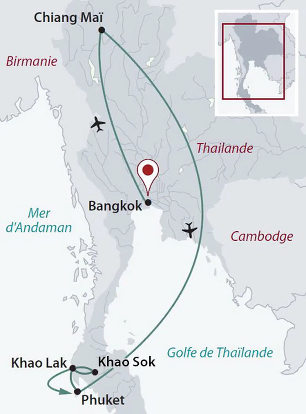 Les étapes de votre circuit individuel privé : Bangkok, Chiang Mai, Bangkok, Phuket, Khao Lak, Khao Sok, Khao Lak, Phuket