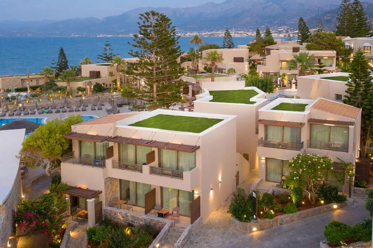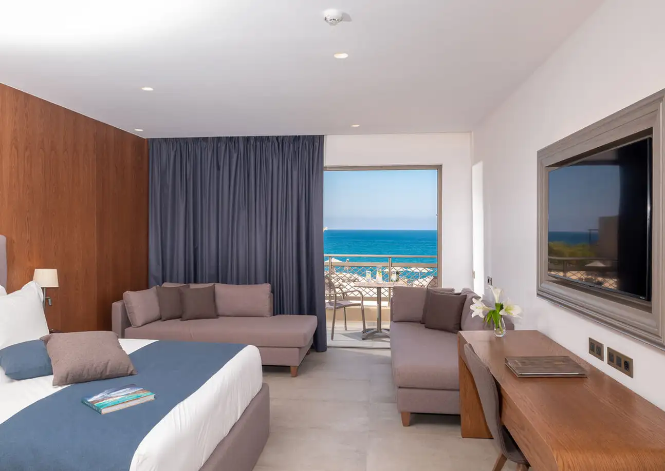Les chambres familiales de luxe sont des chambres spacieuses de style luxueux qui offrent une vue imprenable sur le magnifique jardin ou sur la mer de Crète qui vous accueille tous les matins. Ces chambres ont une superficie d'environ 29 à 32 mètres carrés et disposent d'un lit double king-size et de deux canapés-lits. Chaque chambre est équipée d'une salle de bains avec baignoire ou douche et toilettes. Un balcon ou une terrasse entièrement meublés et des fenêtres allant du sol au plafond, qui laissent entrer beaucoup de lumière naturelle, complètent l'ambiance.