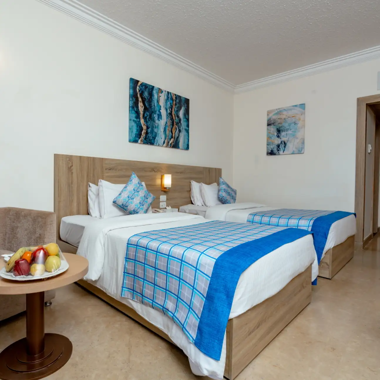 Vous serez logé en chambre standard de 17 à 22 m² pouvant accueillir jusqu'à 3 adultes ou 2 adultes et 2 enfants. La chambre dispose de : balcon ou terrasse, 1 grand lit double ou 2 petits lits, climatisation, mini-frigo (1 bouteille d'eau par jour et par personne), télévision, téléphone, coffre-fort, salle de bains équipée avec douche ou baignoire et sèche-cheveux, bouilloire, fer à repasser (à la demande et selon disponibilité).
