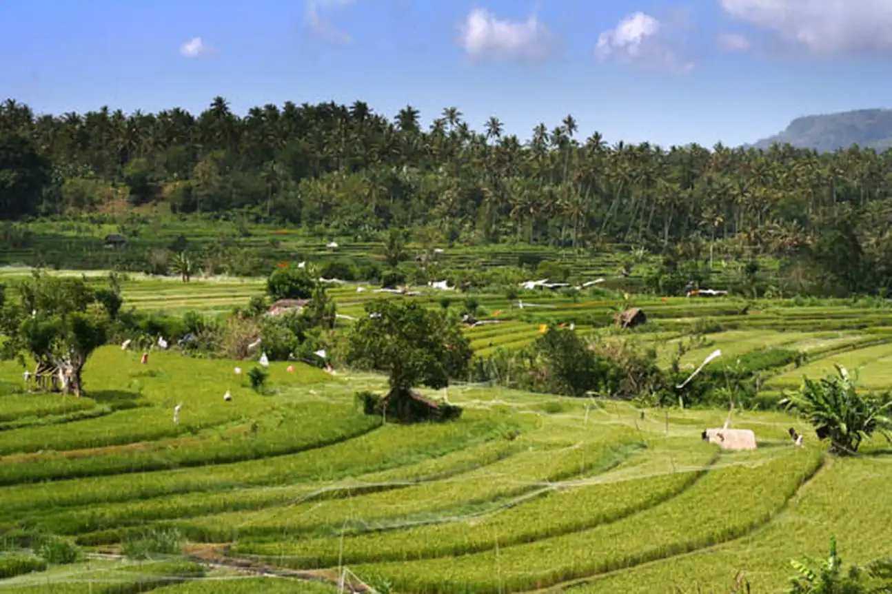 Petit déjeuner à l'hôtel. Dans la matinée, départ vers le village de Tenganan. Ce petit village est connu pour être un des plus ancien village de Bali, habité par les autochtone Bali Aga. Continuation avec une randonnée vers le village de Kastala, situé vers le mont Agung, en passant par les rizières en terrasse. Après la randonnée, déjeuner dans un restaurant local. L'après- midi, départ pour visiter Tirta Gangga, les anciens bain royaux du royaume de Karangasem, suivi par la visite de l'ancien palais d'été de Taman Ujung.