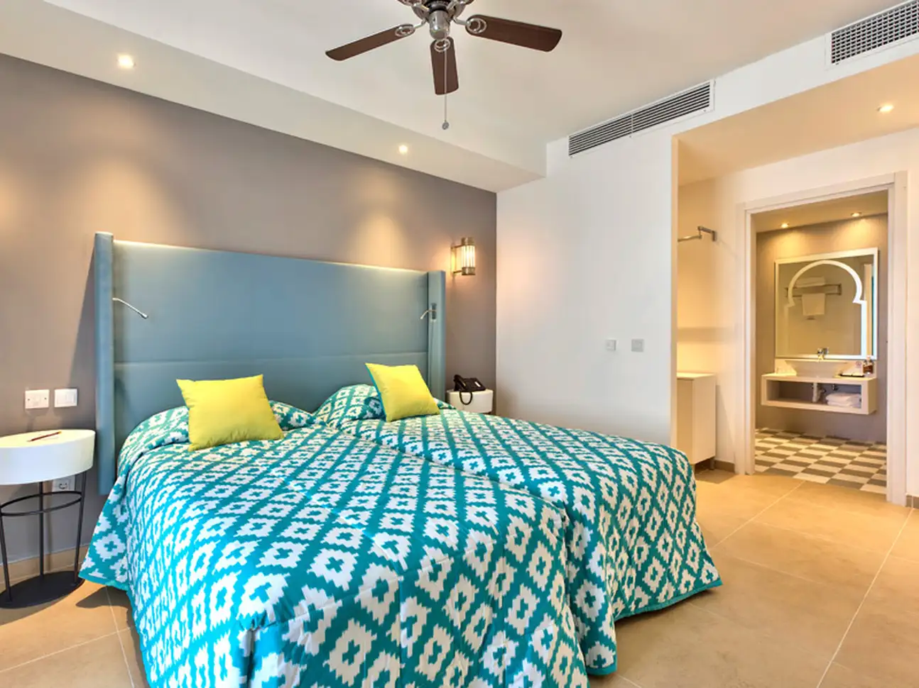 Le San Antonio Hotel & Spa dispose de 536 chambres réparties dans un bâtiment de 6 étages, avec vues sur la campagne, la piscine ou sur la mer. Modernes et climatisées, les chambres sont dotées d'un balcon, d'une salle de bains avec baignoire ou douche, sèche-cheveux, télévision par satellite écran plat, petit réfrigérateur, facilités thé/café, coffre-fort. Une connexion Wi-Fi est par ailleurs accessible gratuitement dans tout l'établissement.