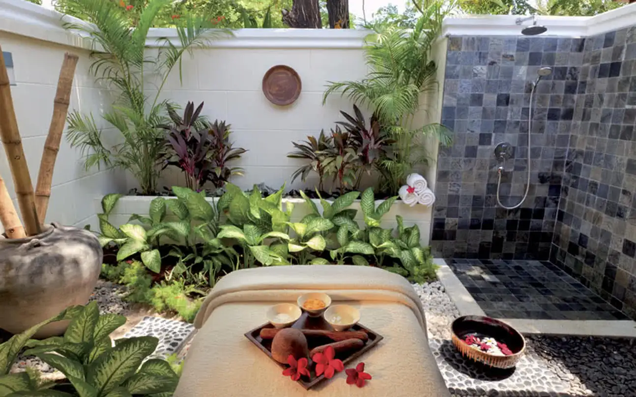 Situés dans l'intimité d'une flore verdoyante à quelques pas de la plage, les bungalows Deluxe possèdent une salle de bains ouverte, un divan en extérieur.