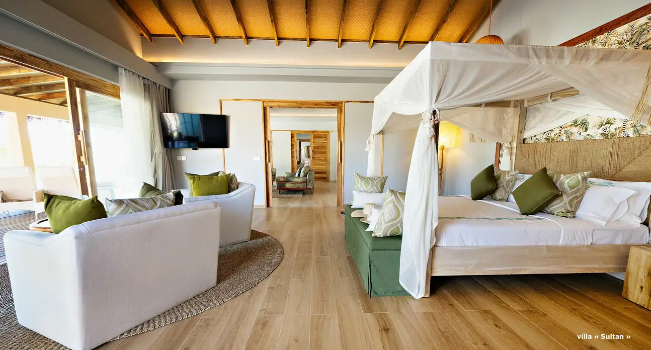 70 villas réparties sur toute l’île, toutes indépendantes les unes des autres, mêlent design contemporain et influences afro-chic. Chaque villa est équipée d’une piscine privée et d’un service de majordome. Sur la côte est de l’île : 26 villas « Sunrise » (200 m²) ; sur la côte ouest : 31 suites « Sunset » (240 m²) ; 8 suites Lagon sur pilotis (170 m²) ; 4 villas Zanzibar 2 chambres (310 m²) et 1 villa Sultan Palace 3 chambres (500 m²).