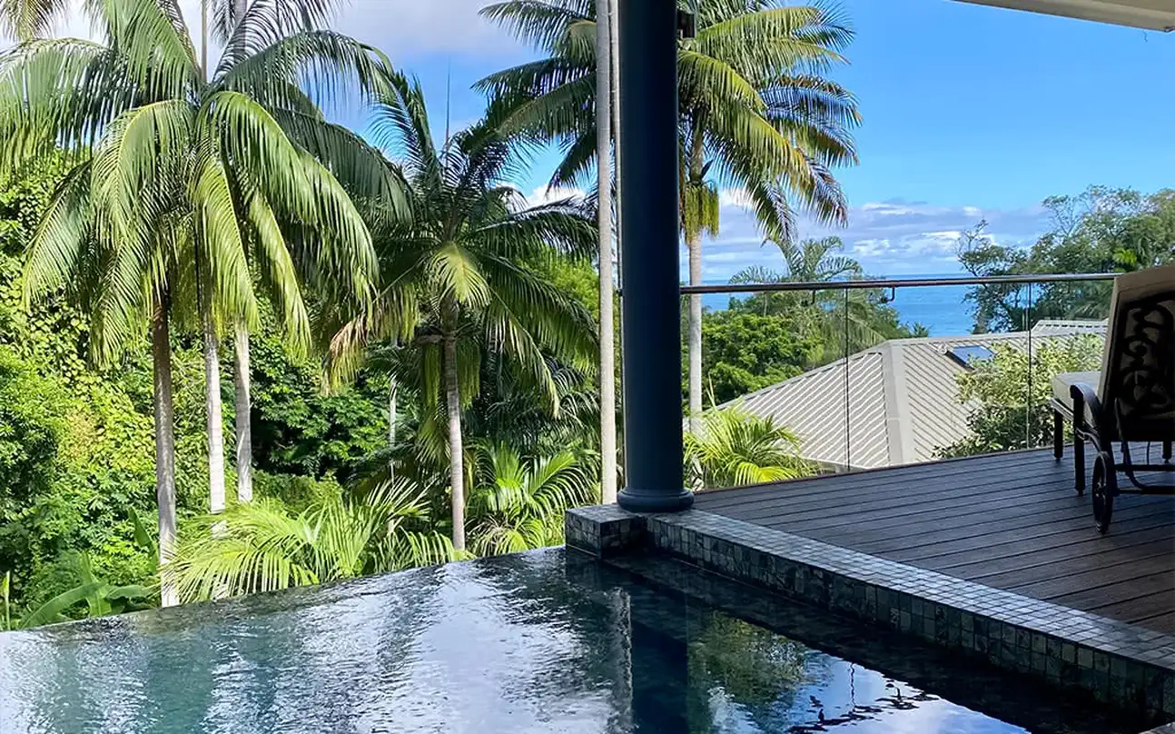 Villa d'une chambre avec piscine : baignoire, douche extèrieure, cour privée, piscine privée, terrasse, chaises longues