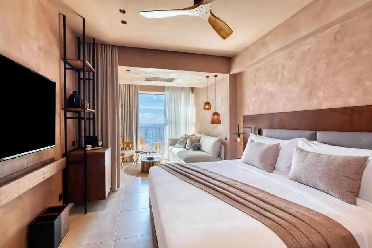 - Suite junior Sapphire accès piscine : D’une superficie de 28 m², cette suite junior Sapphire peut accueillir 2 adultes et 1 enfant avec son lit double et son canapé. Meublée avec beaucoup de goût et décorée avec des matériaux superbes, notamment dans la salle d’eau, elle s’ouvre sur un balcon aménagé qui offre une magnifique vue sur mer et un accès direct et privilégié à l’une des piscines de l’établissement.