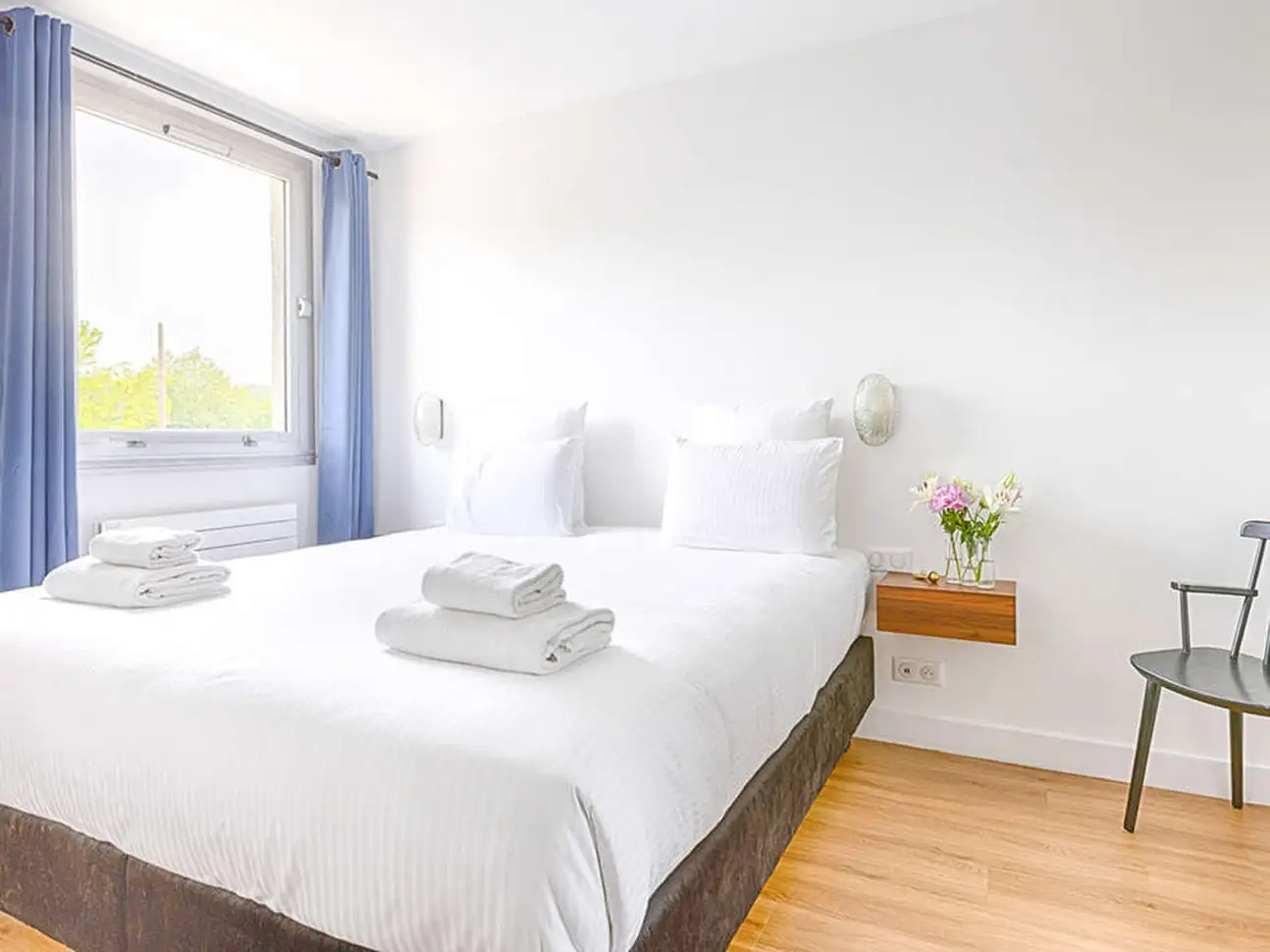 Nos chambres sont modernes, élégamment décorées dans des tons clairs d'orange tanné et de bleu roi, toutes avec salle de bain privative et vue sur nos jardins.