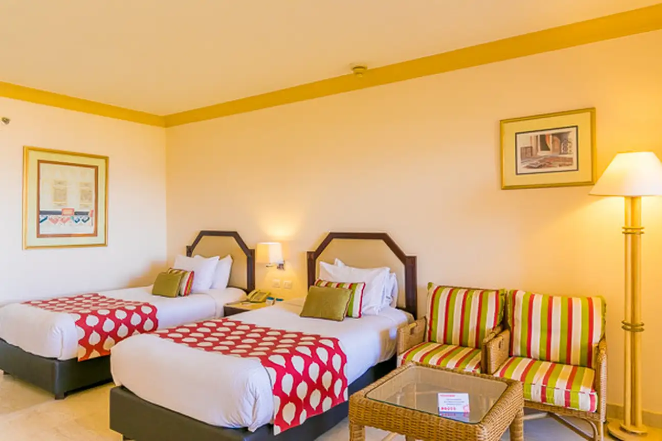 - Chambre deluxe vue mer de 48 m² : mêmes équipements + corbeille de fruits + eau minéral + peignoirs et pantoufles. Capacité : 3 adultes ou 2 adultes + 1 enfant.