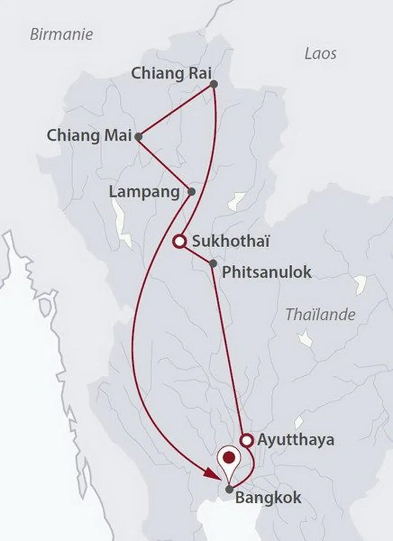 Les étapes de votre circuit en groupe : Bangkok, Ayutthaya, Chainat, Phitsanulok, Sukhothai, Chiang Rai, Rivière Kok (Mae Kok), Triangle d'or, Chiang Mai, Lampang, Bangkok, Phuket