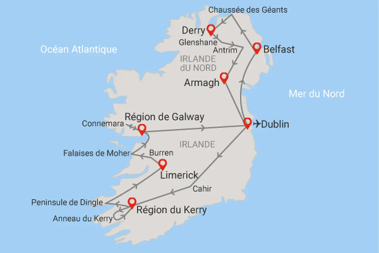 - Autocar moderne du jour 2 au jour 7 et du jour 9 à 11 + transfert à Belfast le jour 8.